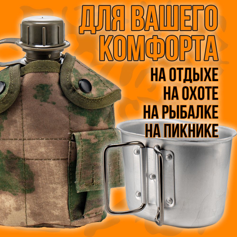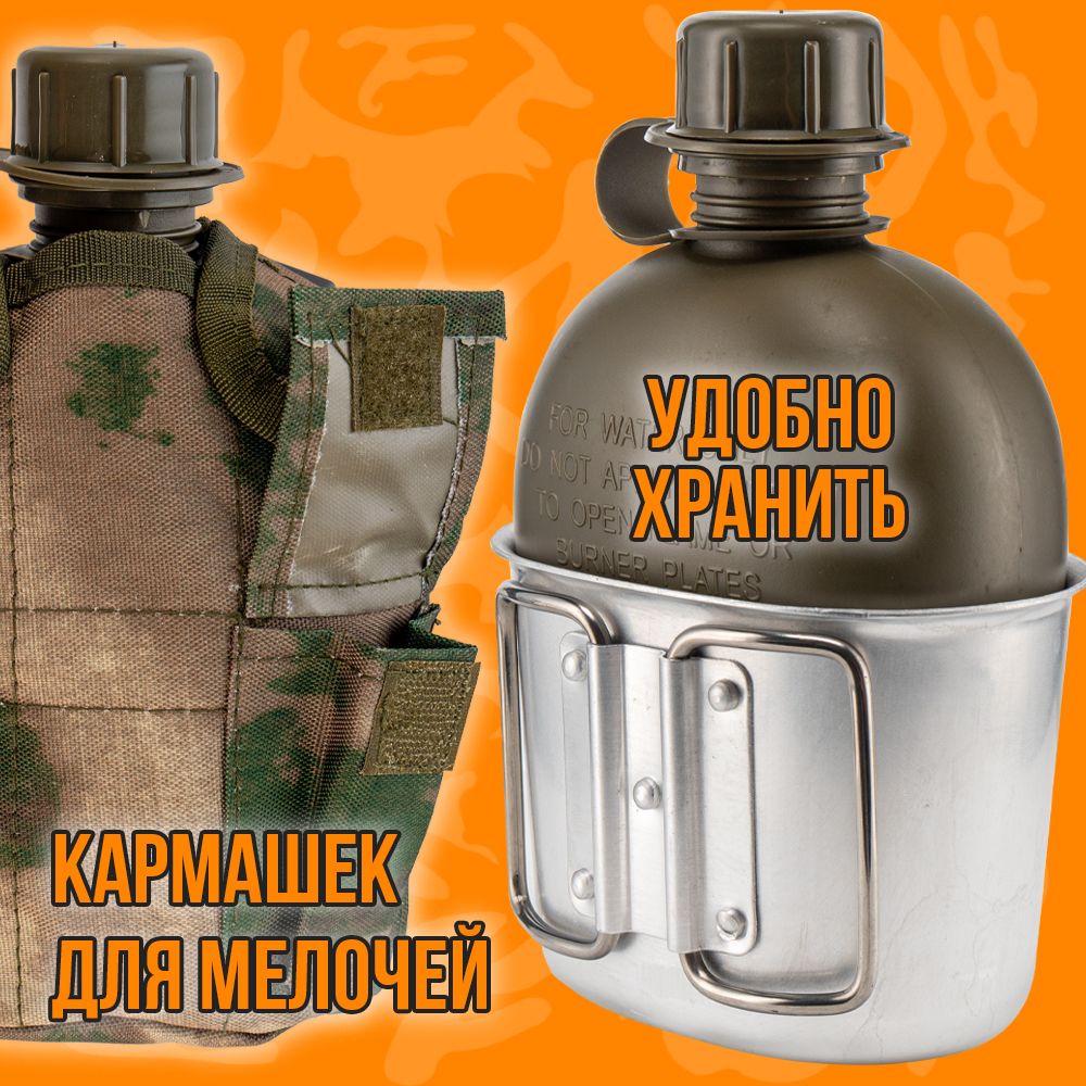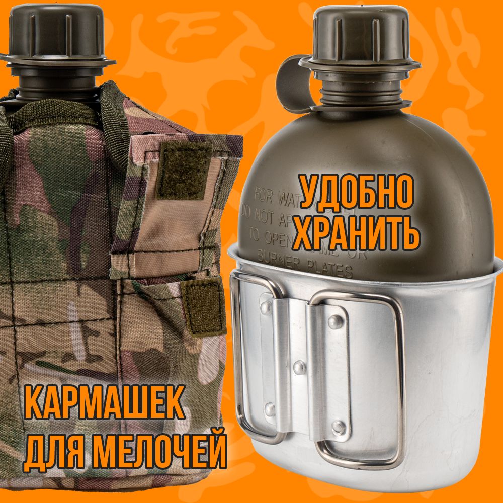 Фляга с котелком в чехле – это универсальная туристическая принадлежность для хранения и переноса питьевой воды и приготовление пищи. Емкость объемом 1л из полимера (толстый ударопрочный пластик) с повышенной стойкостью к деформации, выполнена в виде Армейской Фляжки, с герметично завинчивающейся крышкой с уплотнителем. Бутылка не впитывают запах и легко моются холодной водой. Котелок для приготовления и разогрева пищи из пищевого алюминия, объемом 0,650 л. Для удержания при использовании и переносе имеются две металлические складывающиеся ручки. Оригинальный чехол с кармашком для мелочей изготовлен из плотной ткани с флисовой подкладкой для сохранения тепла/ холода на некоторое время. На оборотной стороне чехла крепление с дополнительными металлическими скобами для быстрой фиксации/съема на рюкзак, одежду, ремень. Для удержания фляги с котелком сверху на лицевой стороне размещены 2 кнопки застежки. Данный набор как один из атрибутов, который всегда пригодится и послужит на даче, на природе, в дороге, на рыбалке, охоте, а красивый эстетичный вид станет хорошим подарком для поклонников активного образа жизни.