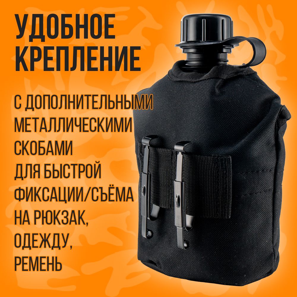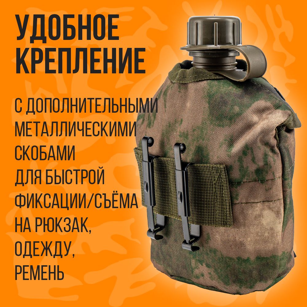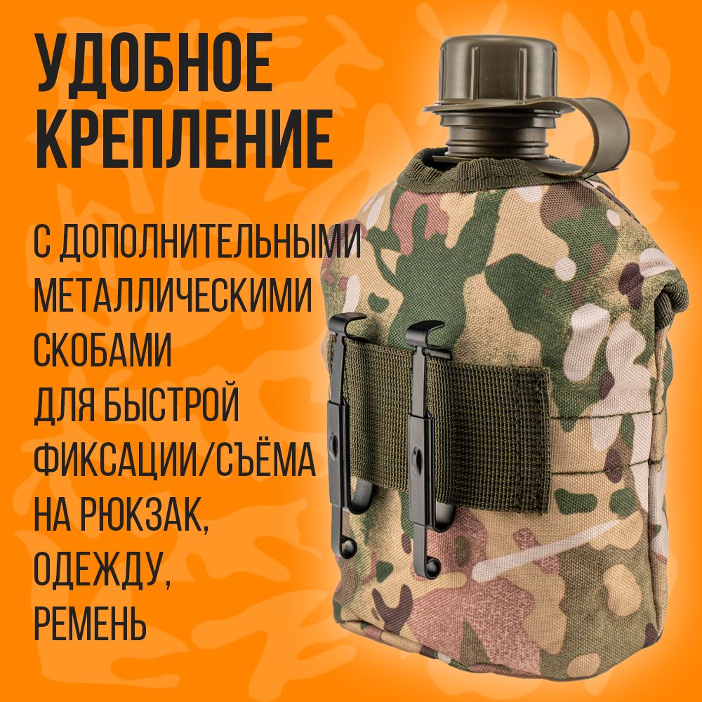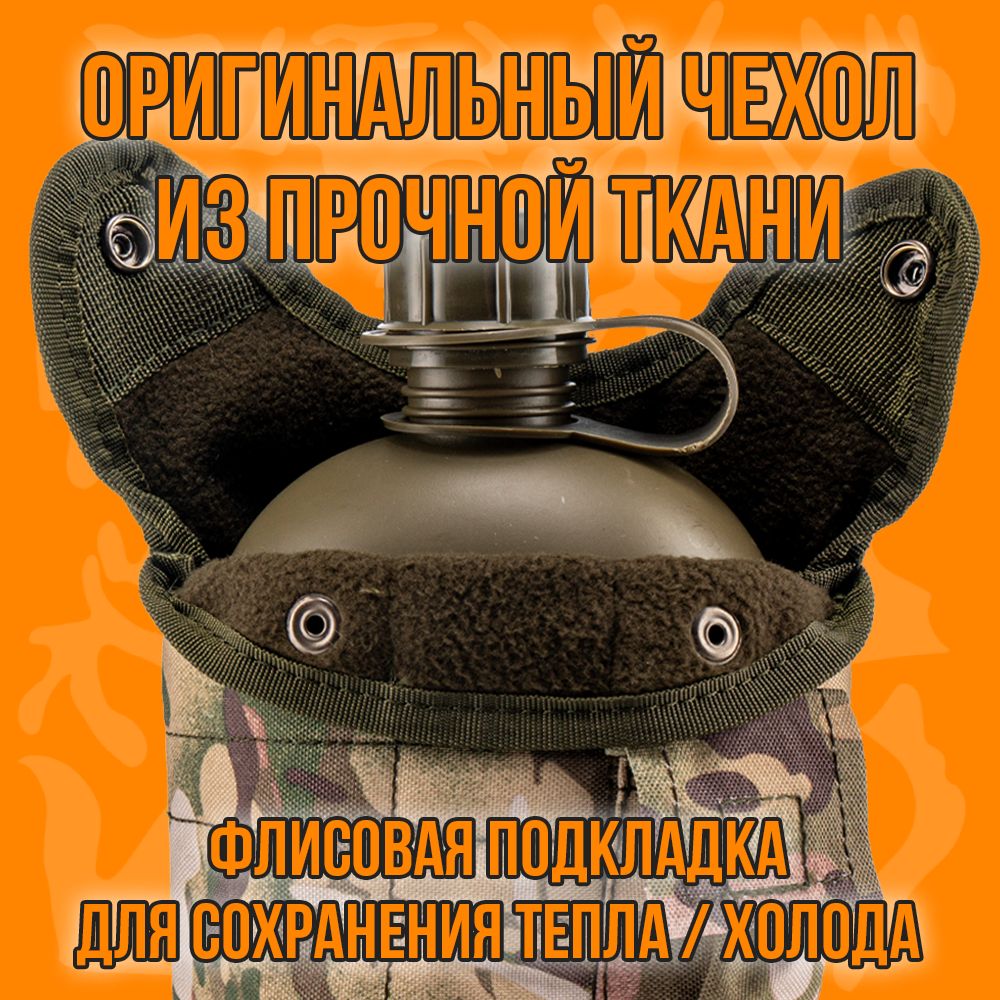Фляга с котелком в чехле – это универсальная туристическая принадлежность для хранения и переноса питьевой воды и приготовление пищи. Емкость объемом 1л из полимера (толстый ударопрочный пластик) с повышенной стойкостью к деформации, выполнена в виде Армейской Фляжки, с герметично завинчивающейся крышкой с уплотнителем. Бутылка не впитывают запах и легко моются холодной водой. Котелок для приготовления и разогрева пищи из пищевого алюминия, объемом 0,650 л. Для удержания при использовании и переносе имеются две металлические складывающиеся ручки. Оригинальный чехол с кармашком для мелочей изготовлен из плотной ткани с флисовой подкладкой для сохранения тепла/ холода на некоторое время. На оборотной стороне чехла крепление с дополнительными металлическими скобами для быстрой фиксации/съема на рюкзак, одежду, ремень. Для удержания фляги с котелком сверху на лицевой стороне размещены 2 кнопки застежки. Данный набор как один из атрибутов, который всегда пригодится и послужит на даче, на природе, в дороге, на рыбалке, охоте, а красивый эстетичный вид станет хорошим подарком для поклонников активного образа жизни.
