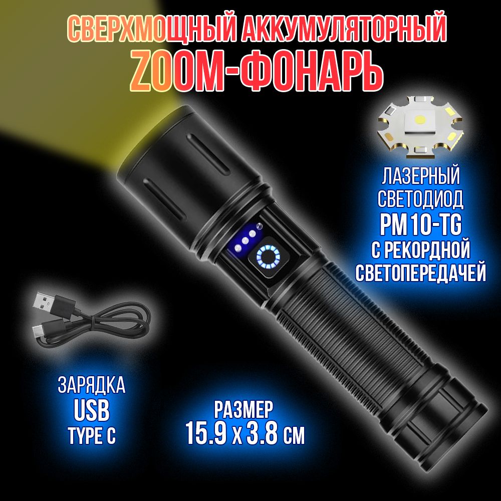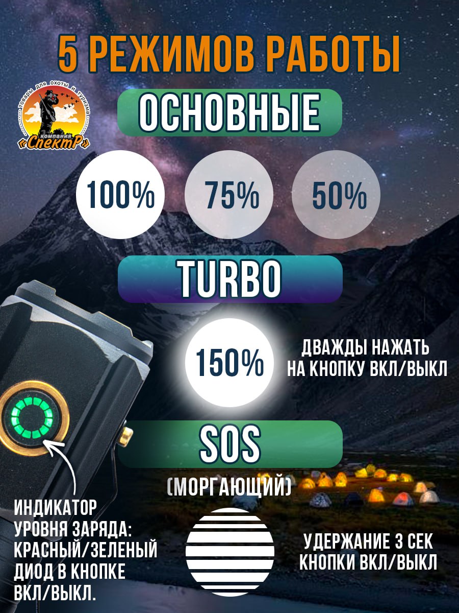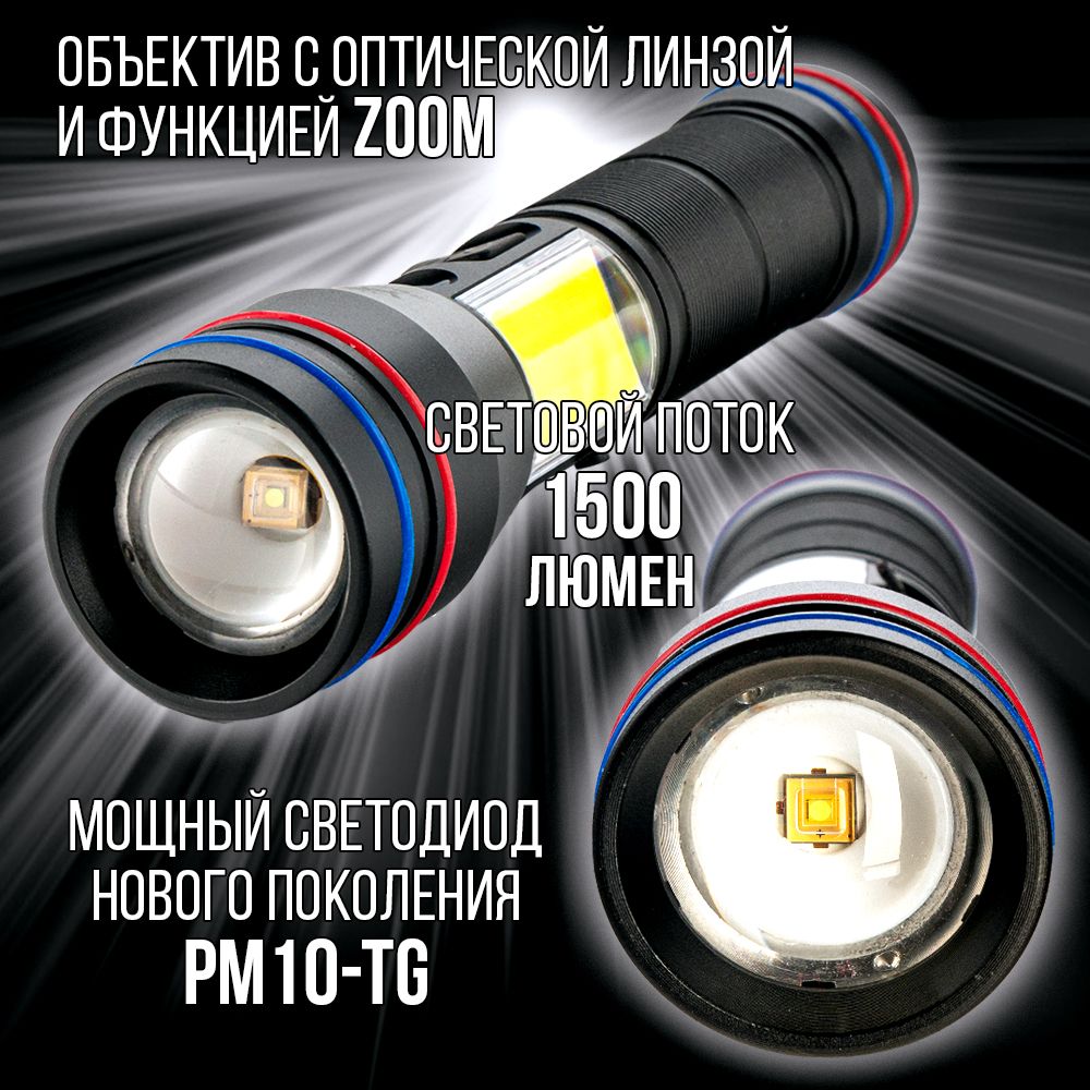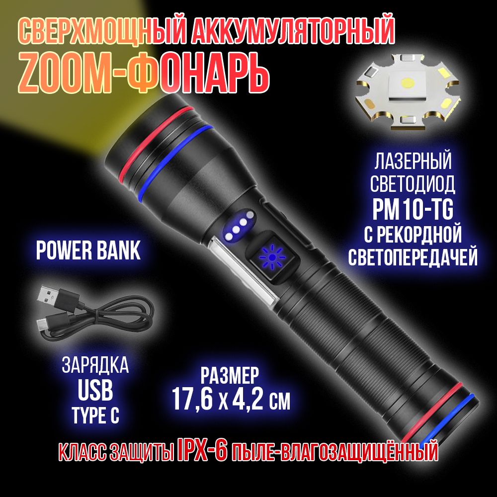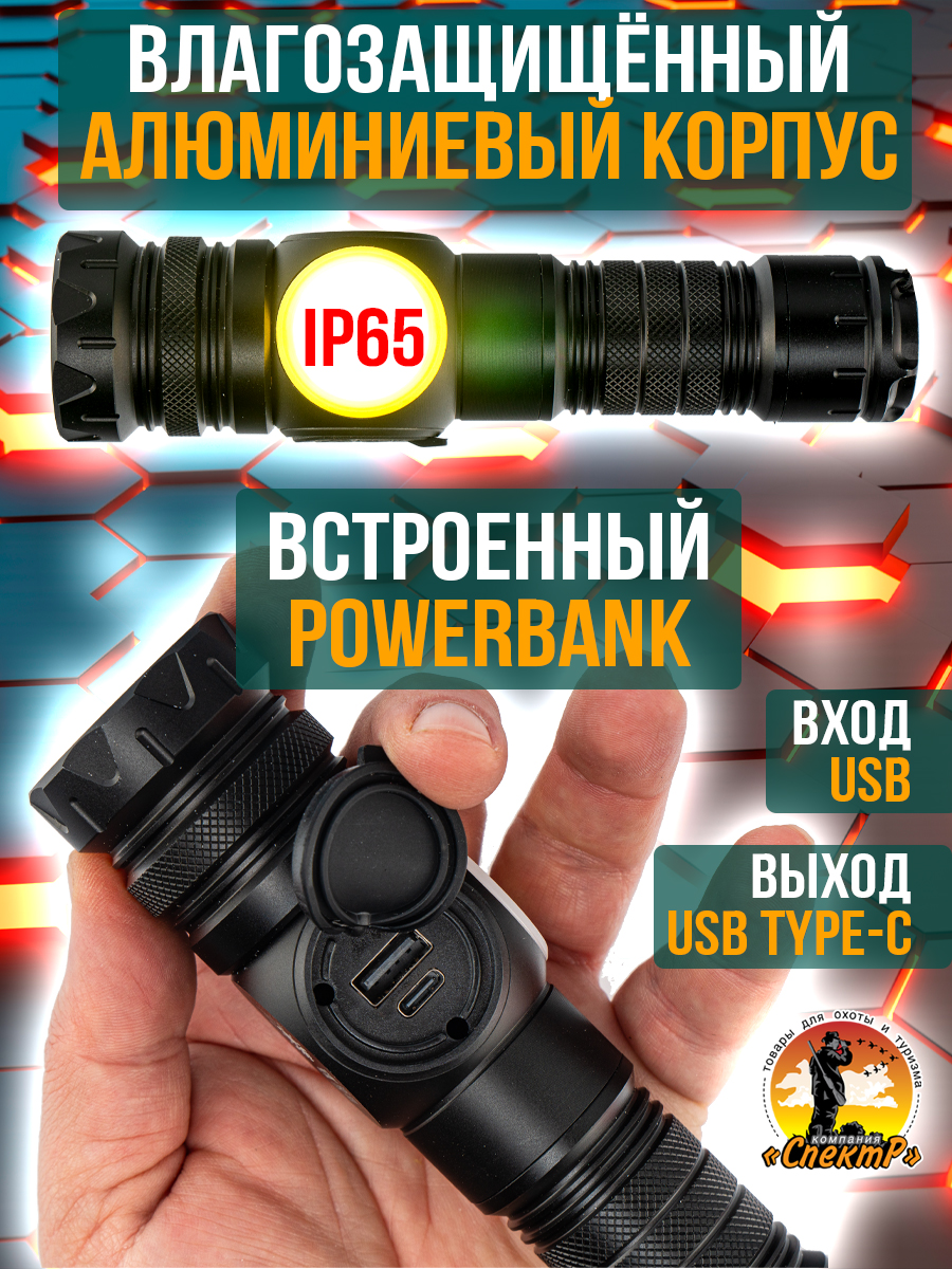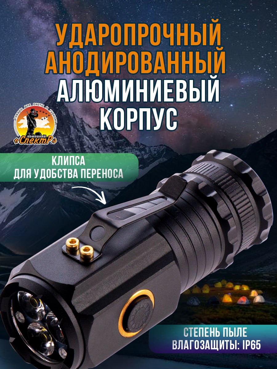Модель 6310 – многофункциональный, аккумуляторный, с мощным/ярким свечением ручной фонарь. Особенностью является светодиод нового поколения (новинка 2023г) «РМ10-TG » с улучшенной теплоотдачей, рекордными показателями светопередачи, позволяющий увеличить световой поток, уменьшить расход потребляемой энергии (на 50%, в сравнении с диодом Р50-Р90) и увеличить продолжительность его срока службы. Дальность и широкий угол освещения выполняет объектив с оптической линзой и функцией Zoom, позволяющий рассеивать световой пучок от широкого до узконаправленного пятна, в зависимости от потребности пользователя. На боковой панели имеется дополнительный COB диод (белый, красный свет), выполняющий роль кемпингового фонарика. Режим работы диода РМ10-TG: яркий, экономичный, сигнальный (стробоскоп). СОВ диода: яркий, экономичный и моргающий по переменно красным/белым цветом. Ударопрочный корпус фонаря из анодированного алюминия и резиновыми кнопками обеспечивает герметизацию и защиту от пыли и влаги. Качественный РС материал для лампового стекла и линз делает их прочными, прозрачными и жароустойчивыми. Зарядить фонарь можно от любого USB выхода. Разъем питания Type-C. Так же на корпус встроен индикатор уровня заряда из 4х диодов и USB разъем для использования фонаря в роли Power Bank, для зарядки электронных мобильных устройств. Источник питания съемный аккумулятор 26650. В заднюю крышку встроен мощный магнит, для удобного крепления фонаря в нужном положении. Сфера применения данной модели от бытового до профессионального использования, а современный дизайн ручного фонаря послужит хорошим подарком для поклонников активного образа жизни.