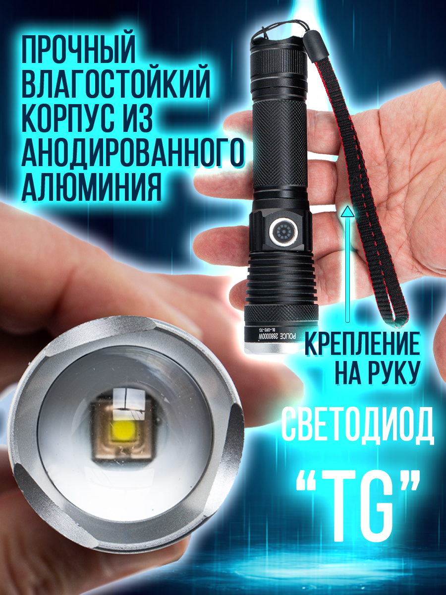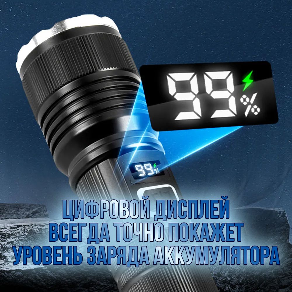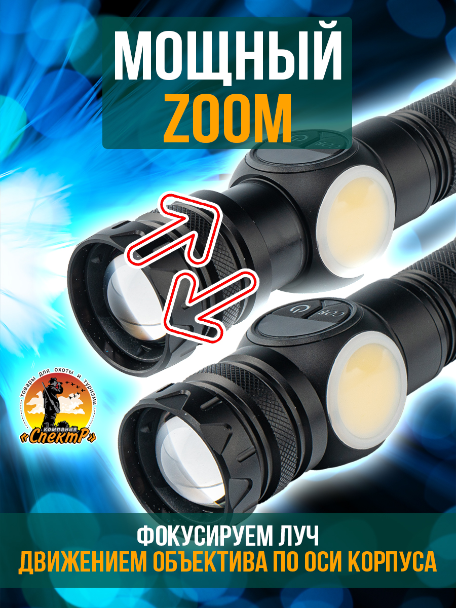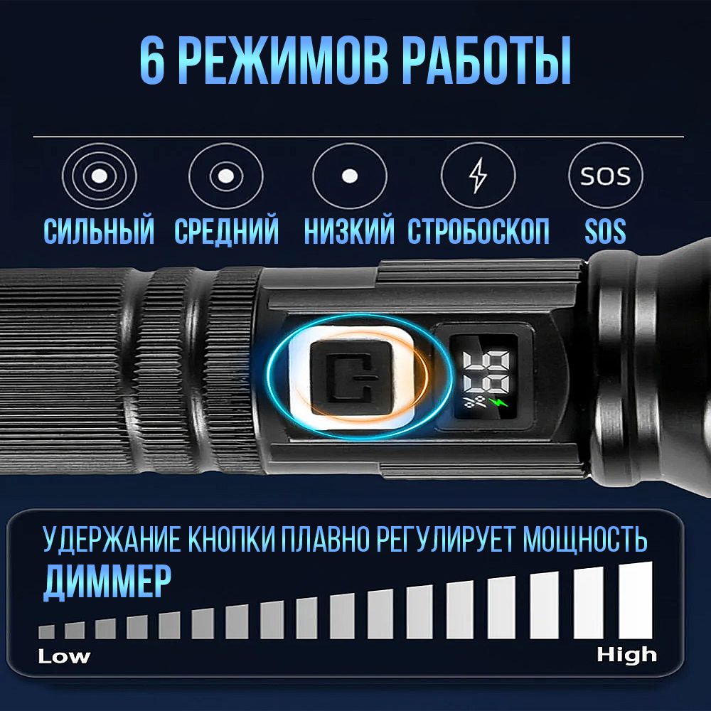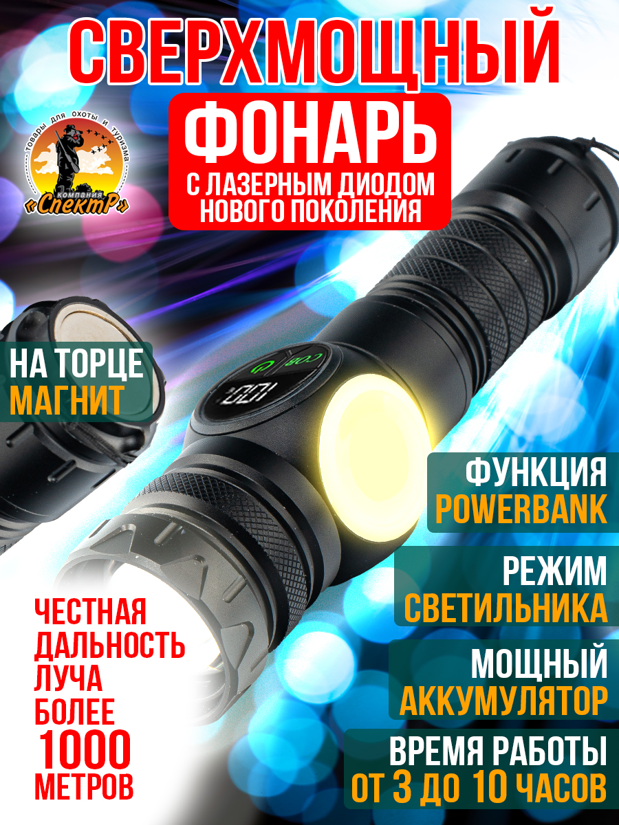 Модель 6310 – многофункциональный, аккумуляторный, с мощным/ярким свечением ручной фонарь. Особенностью является светодиод нового поколения (новинка 2023г) «РМ10-TG » с улучшенной теплоотдачей, рекордными показателями светопередачи, позволяющий увеличить световой поток, уменьшить расход потребляемой энергии (на 50%, в сравнении с диодом Р50-Р90) и увеличить продолжительность его срока службы. Дальность и широкий угол освещения выполняет объектив с оптической линзой и функцией Zoom, позволяющий рассеивать световой пучок от широкого до узконаправленного пятна, в зависимости от потребности пользователя. На боковой панели имеется дополнительный COB диод (белый, красный свет), выполняющий роль кемпингового фонарика. Режим работы диода РМ10-TG: яркий, экономичный, сигнальный (стробоскоп). СОВ диода: яркий, экономичный и моргающий по переменно красным/белым цветом. Ударопрочный корпус фонаря из анодированного алюминия и резиновыми кнопками обеспечивает герметизацию и защиту от пыли и влаги. Качественный РС материал для лампового стекла и линз делает их прочными, прозрачными и жароустойчивыми. Зарядить фонарь можно от любого USB выхода. Разъем питания Type-C. Так же на корпус встроен индикатор уровня заряда из 4х диодов и USB разъем для использования фонаря в роли Power Bank, для зарядки электронных мобильных устройств. Источник питания съемный аккумулятор 26650. В заднюю крышку встроен мощный магнит, для удобного крепления фонаря в нужном положении. Сфера применения данной модели от бытового до профессионального использования, а современный дизайн ручного фонаря послужит хорошим подарком для поклонников активного образа жизни.