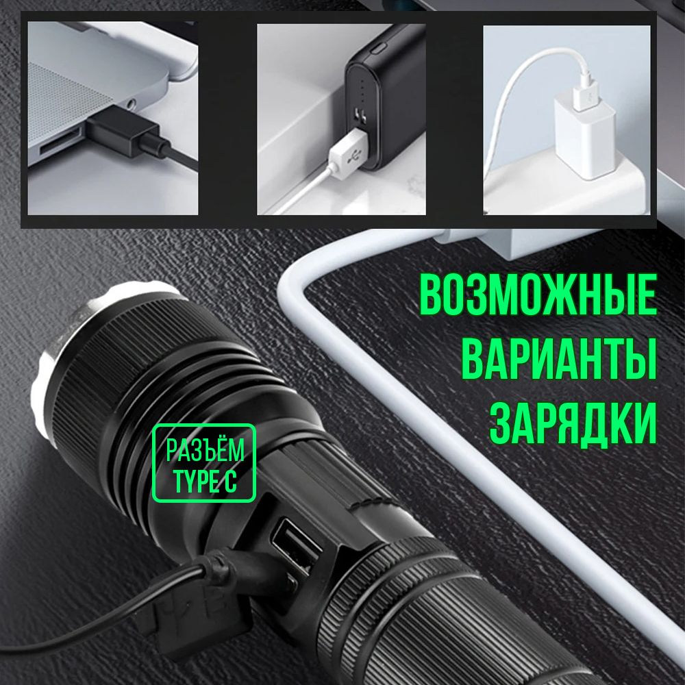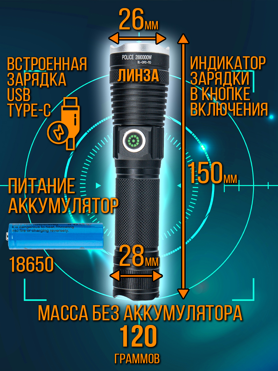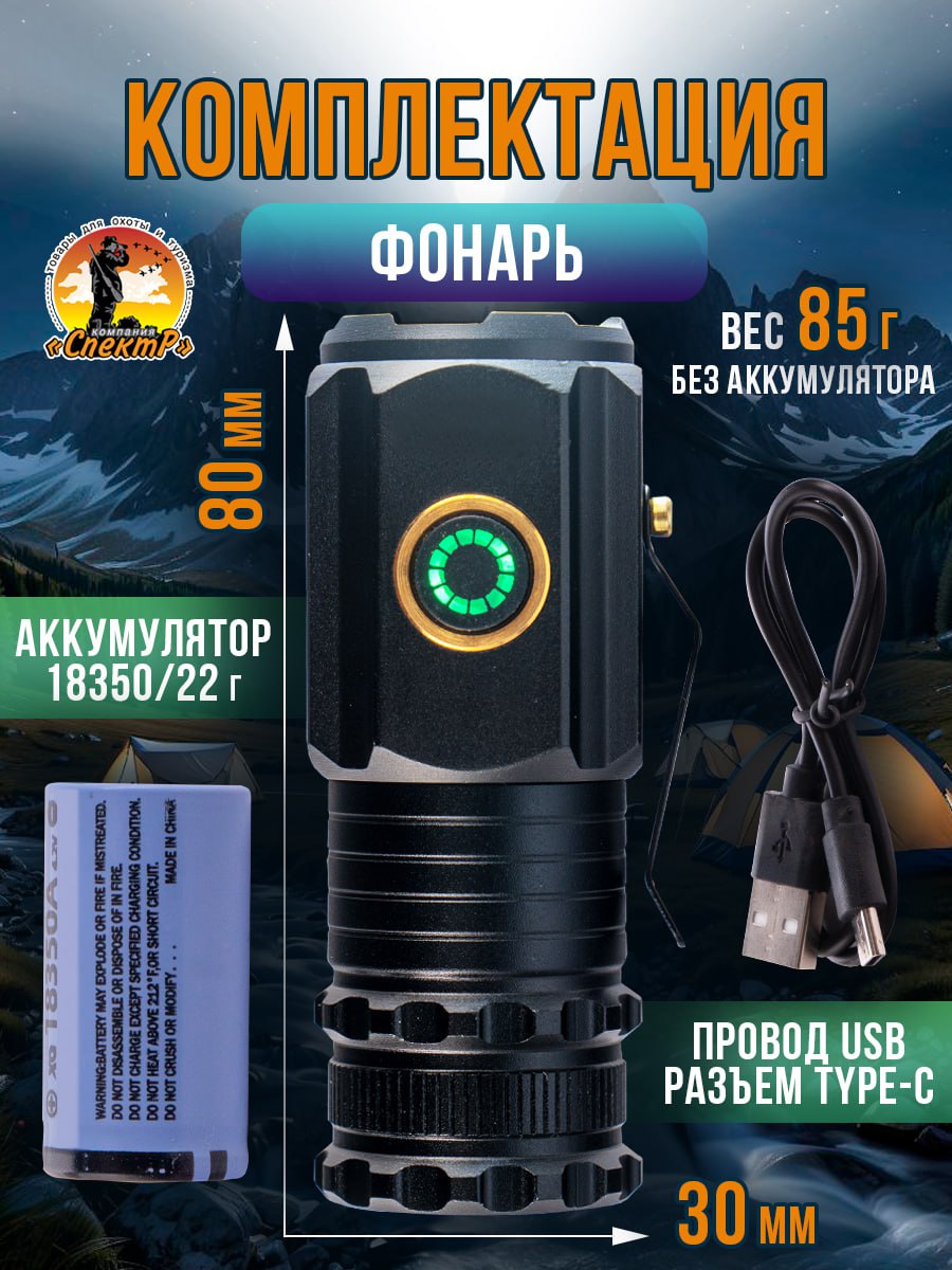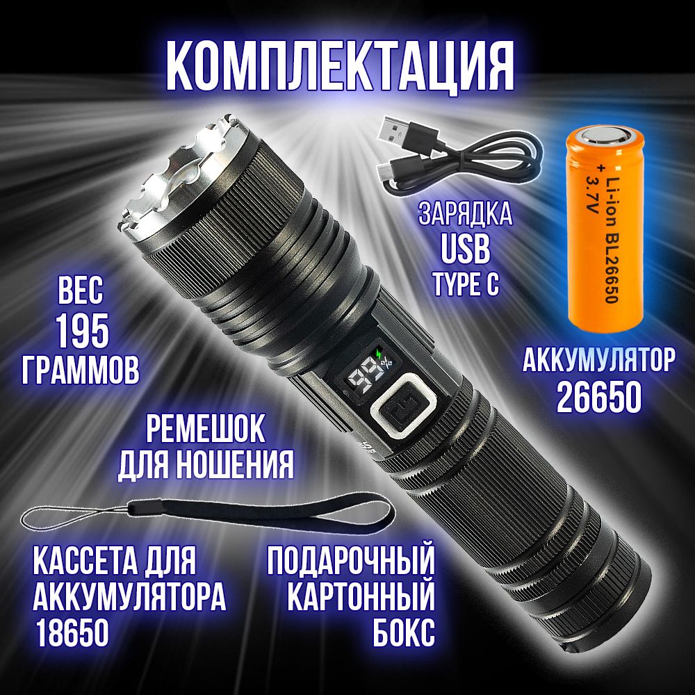 - комплектация: фонарь, акк.26650, провод USB (разъем Type-C).