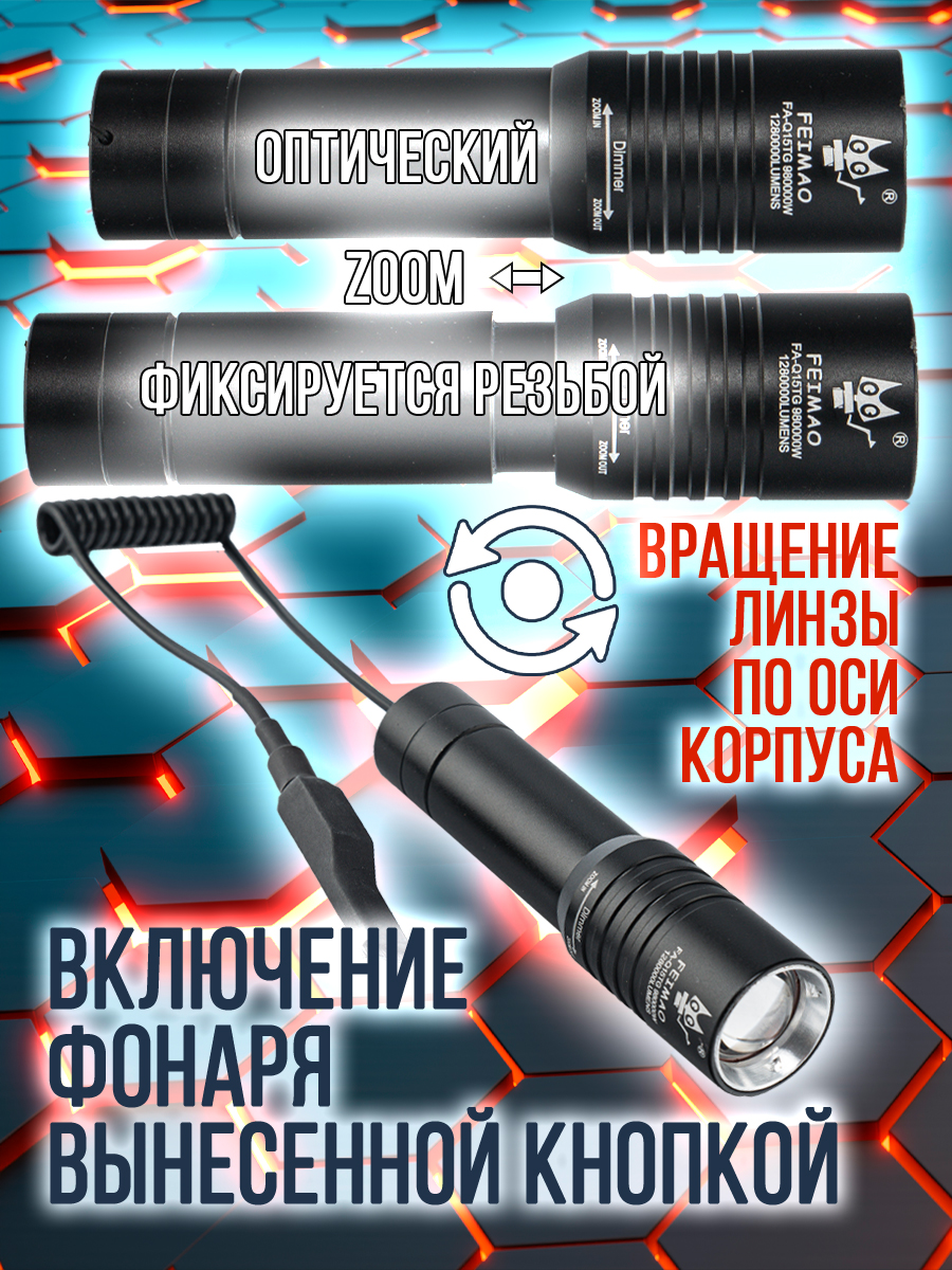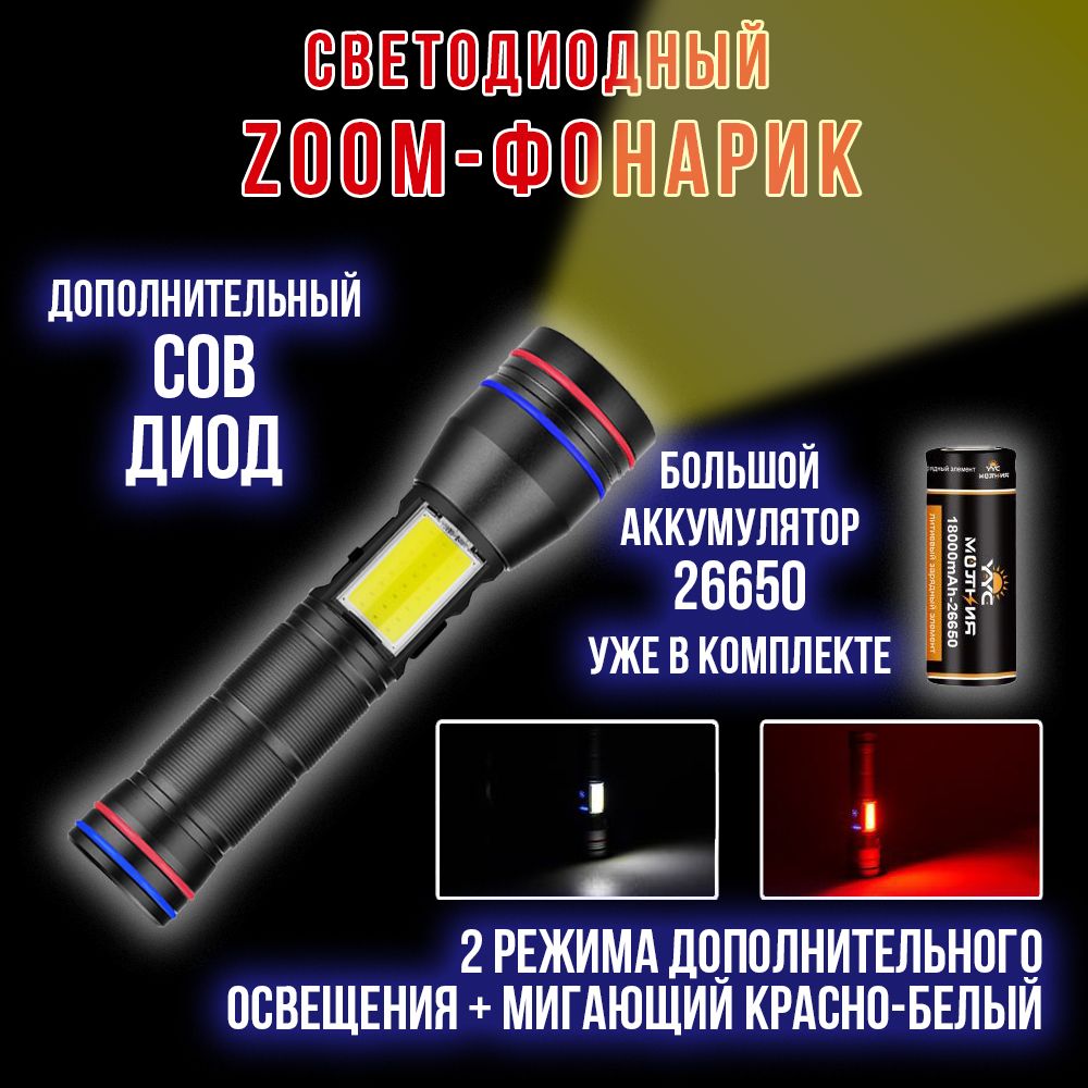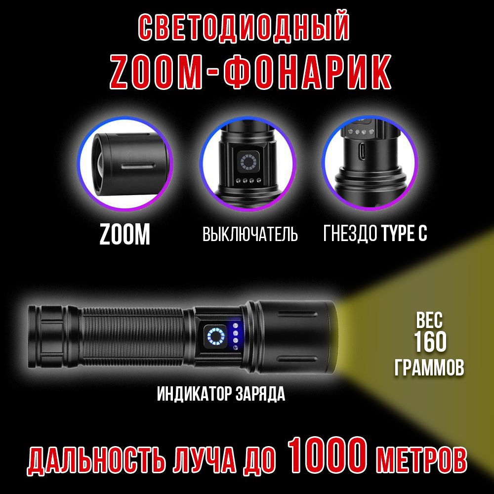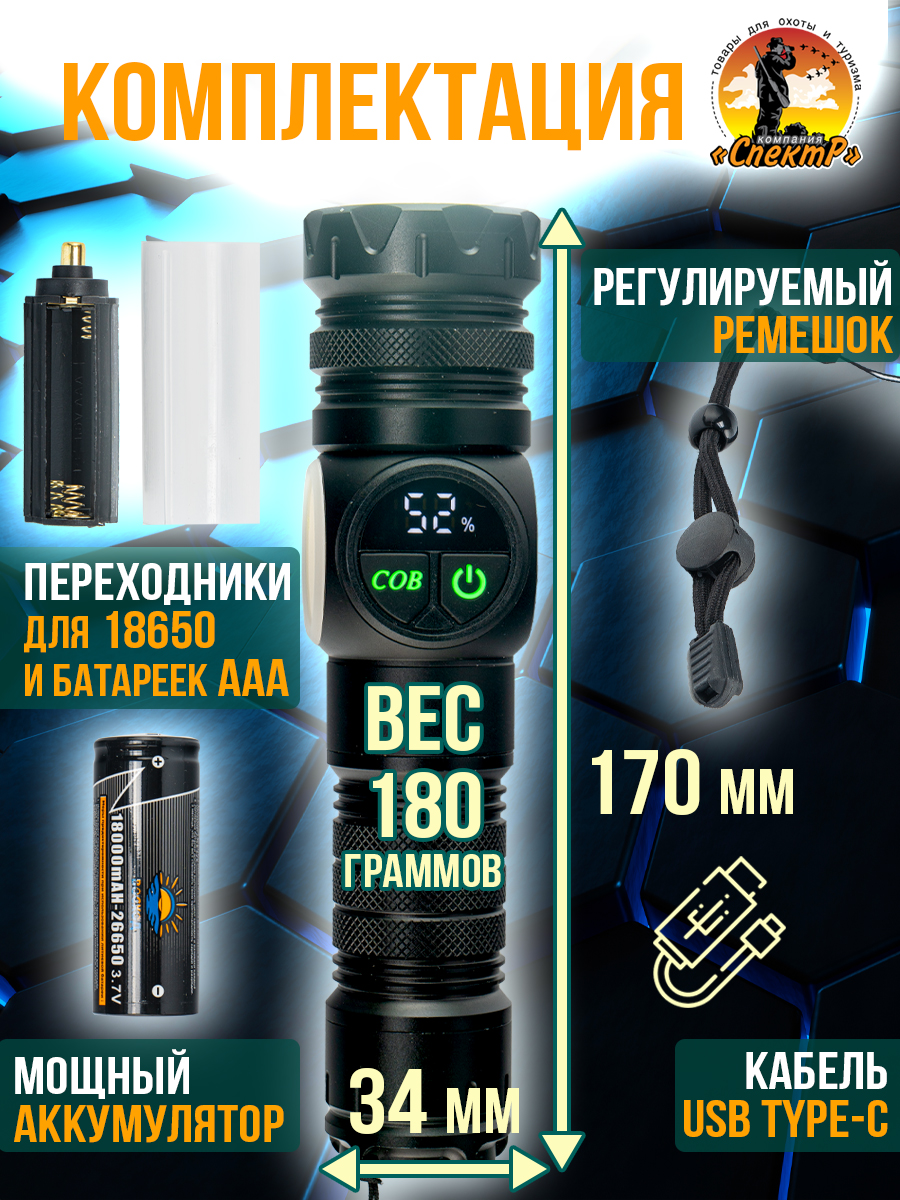 - комплектация: фонарь, акк.26650, провод USB (разъем Type-C).