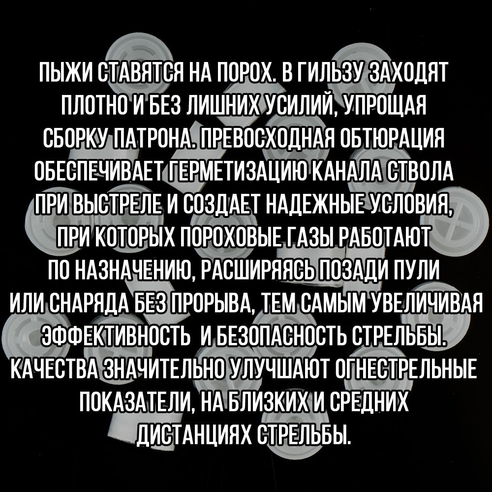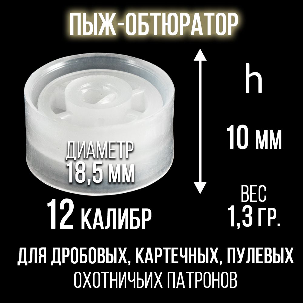 Пыж-обтюратор + Прокладка для пластиковой гильзы – изделия полиэтиленовые, предназначенные для снаряжения дробовых, картечных или пулевых охотничьих патронов гладкоствольного оружия 20 калибра. Обтюратор ставятся на порох. В гильзу заходят плотно и без лишних усилий, упрощая сборку патрона. Превосходная обтюрация обеспечивает герметизацию канала ствола при выстреле и создает надежные условия, при которых пороховые газы работают по назначению, расширяясь позади пули или снаряда без прорыва, тем самым увеличивая эффективность и безопасность стрельбы. Пыж отсекает и аккумулирует силу пороховых газов, создавая максимально давление между пыжом и стенкой гильзы. Отличительной особенность данного изделия является подобранный специалистами оптимальный размер, что обеспечивает максимальную обтюрацию. Все перечисленные качества значительно улучшают огнестрельные показатели, на близких и средних дистанциях стрельбы.