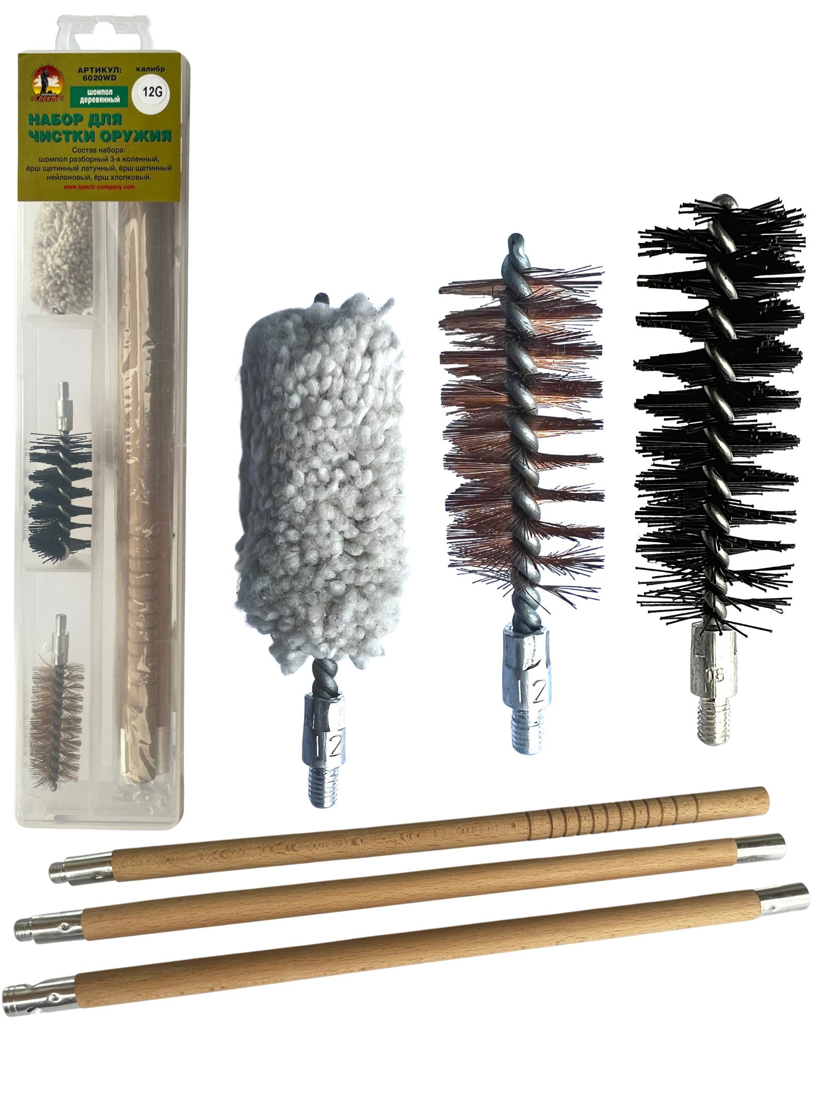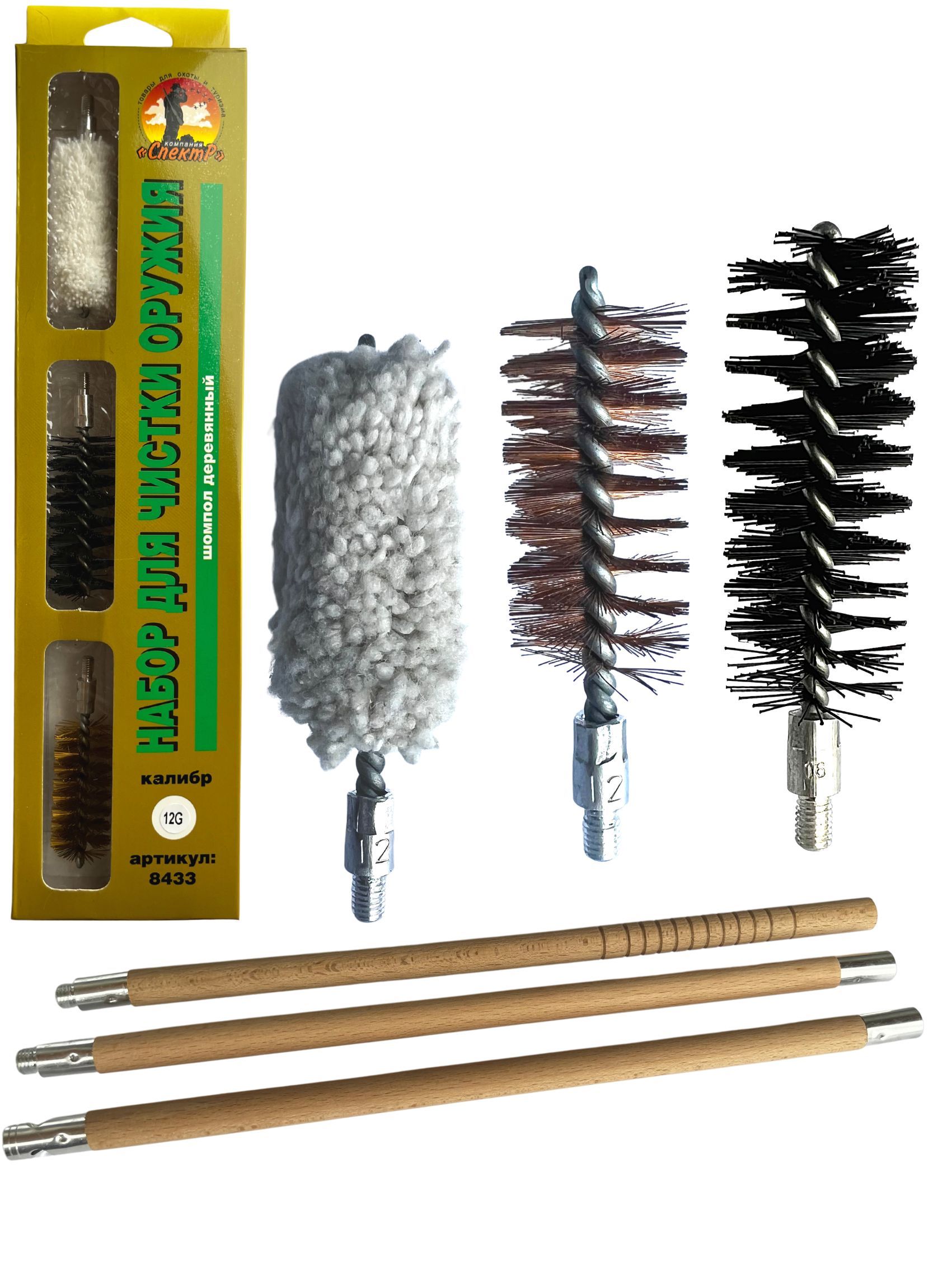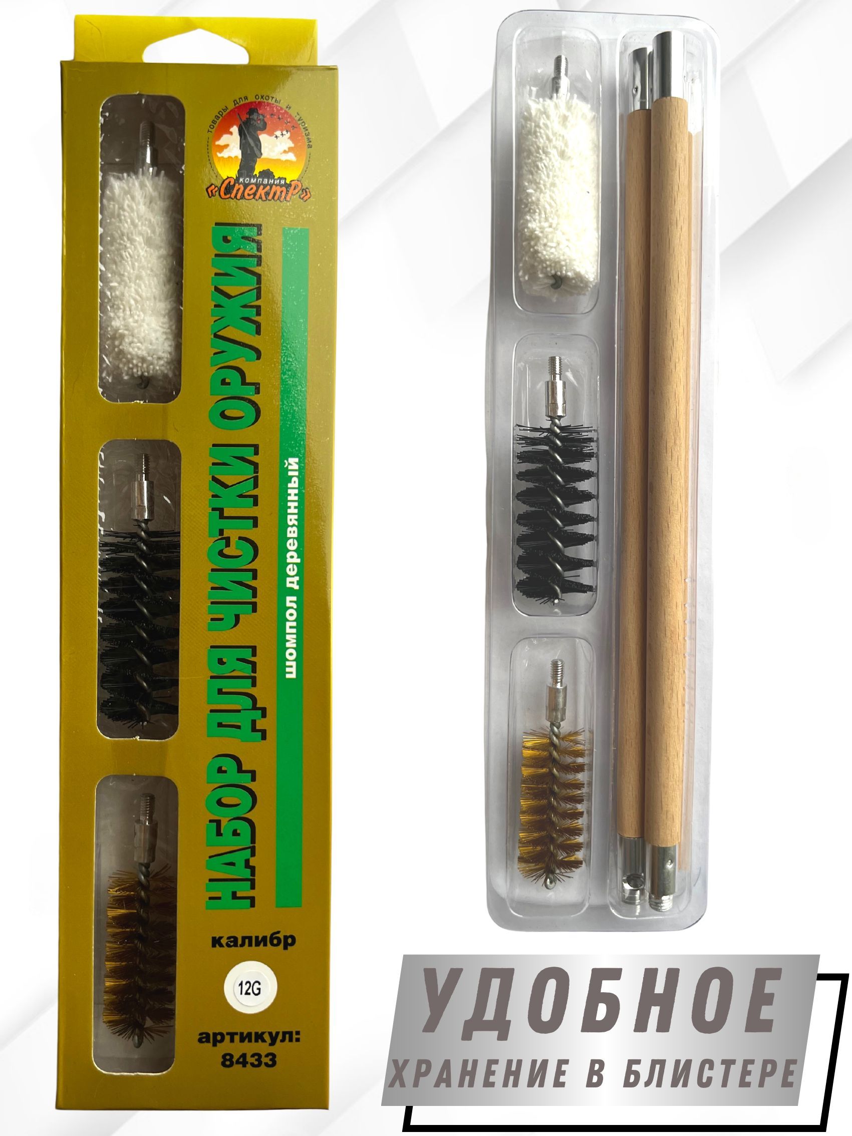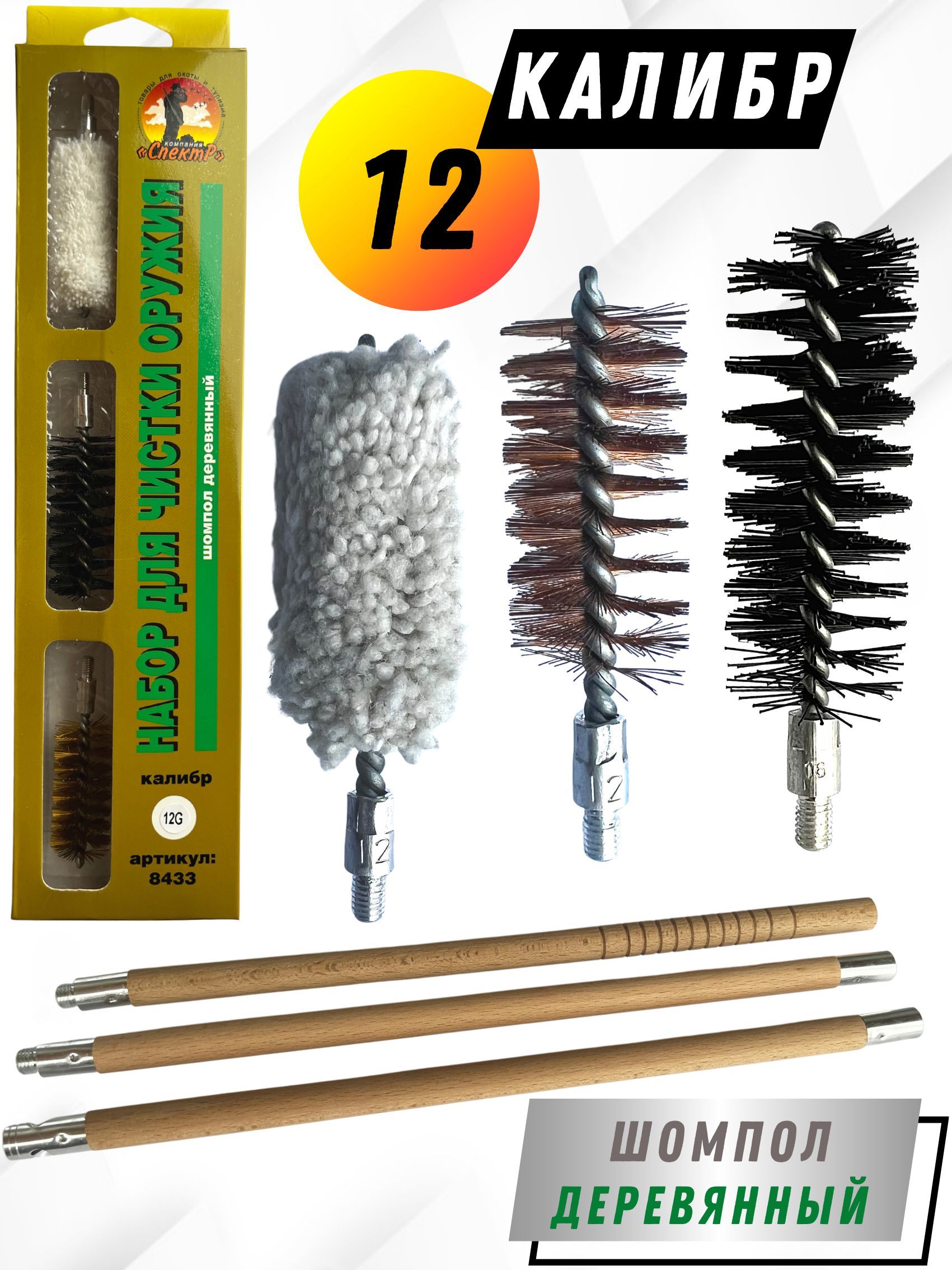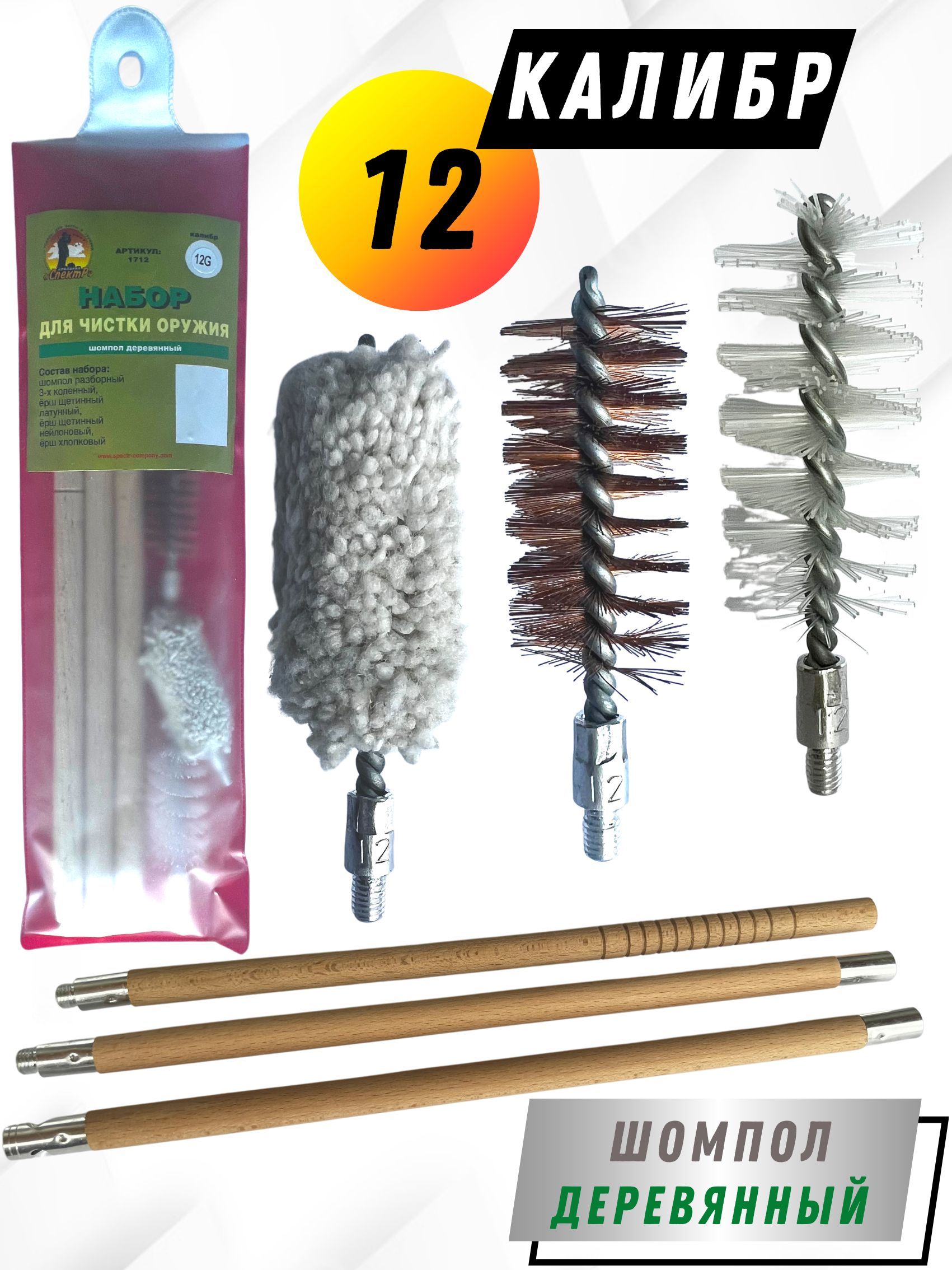 Набор для чистки оружия 12клб в БЛИСТЕРЕ с деревянным шомполом (8433-12).