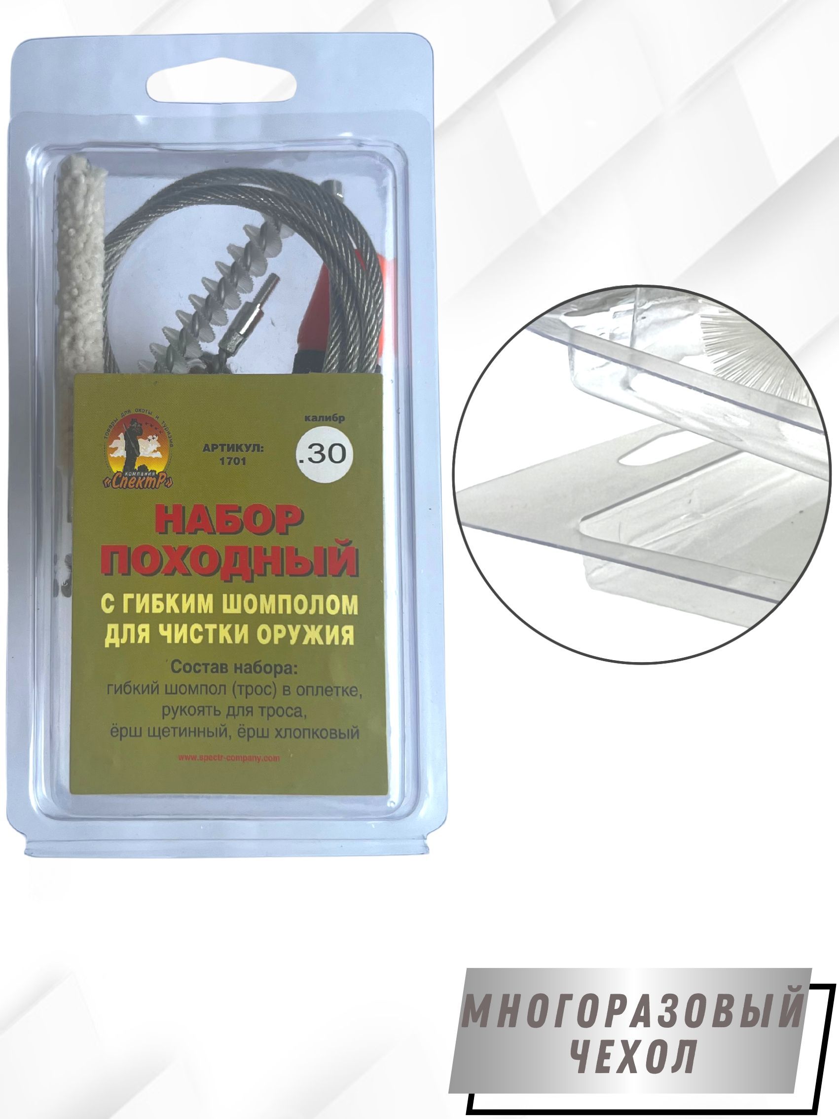 Набор «ПОХОДНЫЙ №1» - предназначен для чистки нарезного оружия в полевых условиях. Компактные размеры делают его мобильным и удобным средством после стрельбы сохранить стволы оружия в чистоте. Гибкий шомпол представляет собой металлический трос в пластиковой оплетке, который не допускает царапин внутри ствола и оборудован быстросъемной рукоятью. На одном конце троса металлический наконечник для фиксации ершей, на другом металлический наконечник для быстрого и свободного прохождения гибкого шомпола через ствол и фиксации троса с рукоятью, для протаскивания ершей - тем самым осуществляя чистку ствола ружья. Шомпол надежен и долговечен. Все средство для чистки размещаются в компактный, пластиковый, многоразовый блистер и оставляют место для других предметов (вишер, патчи…). Блистер имеет евро подвес, что очень удобно при переносе или хранении. Набор не займет много места и с легкостью уместится в карман. К чистке необходимо приобрести оружейное масло.Выбирая набор производства Компании Спектр, вы сможете произвести качественную чистку, ваше оружие будет всегда готово к стрельбе, а эстетичный внешний вид набора послужит хорошим подарком любому стрелку.