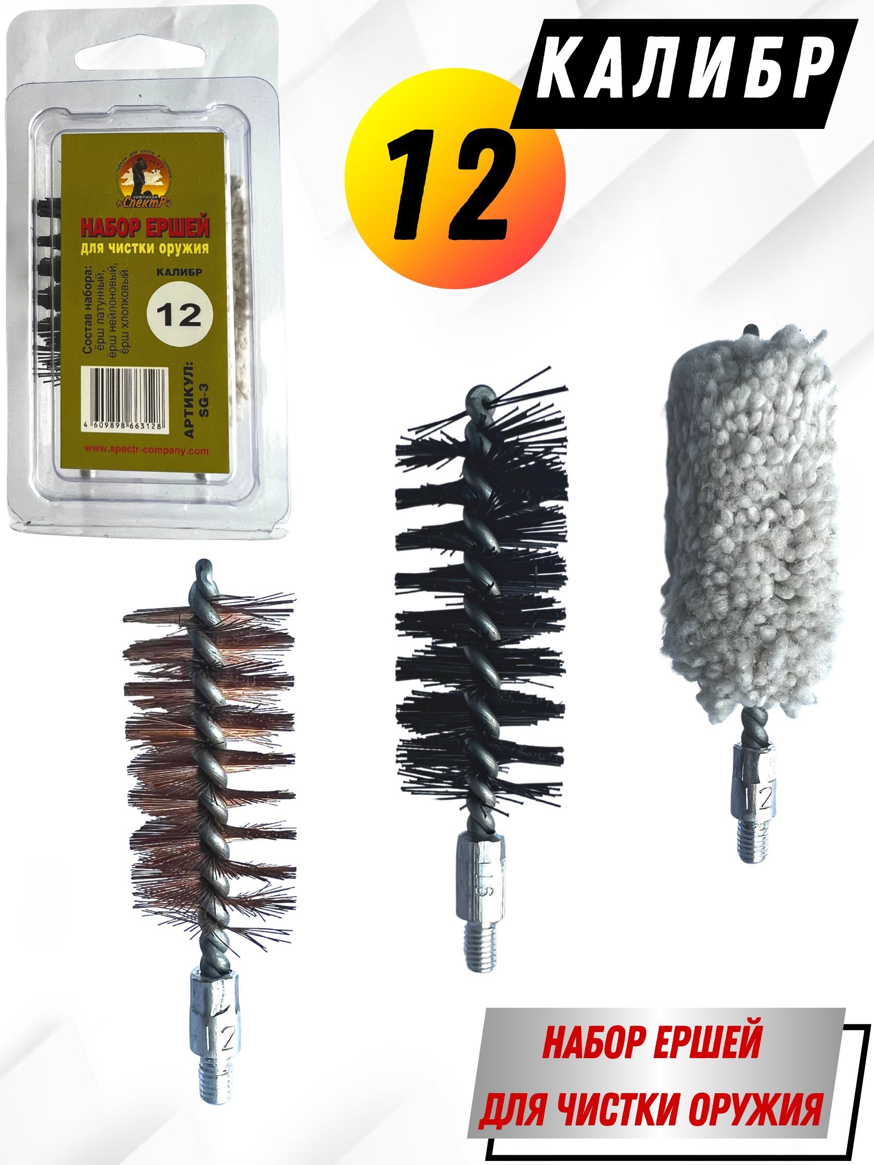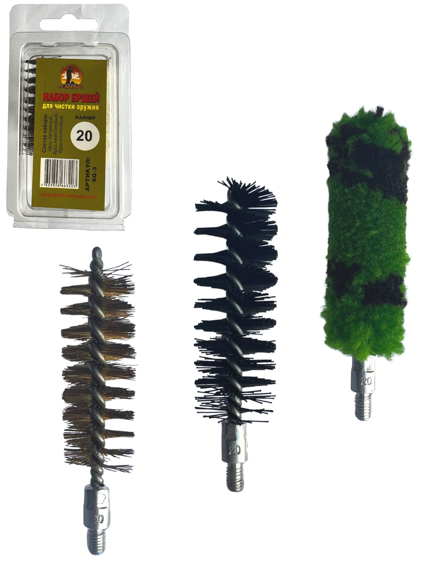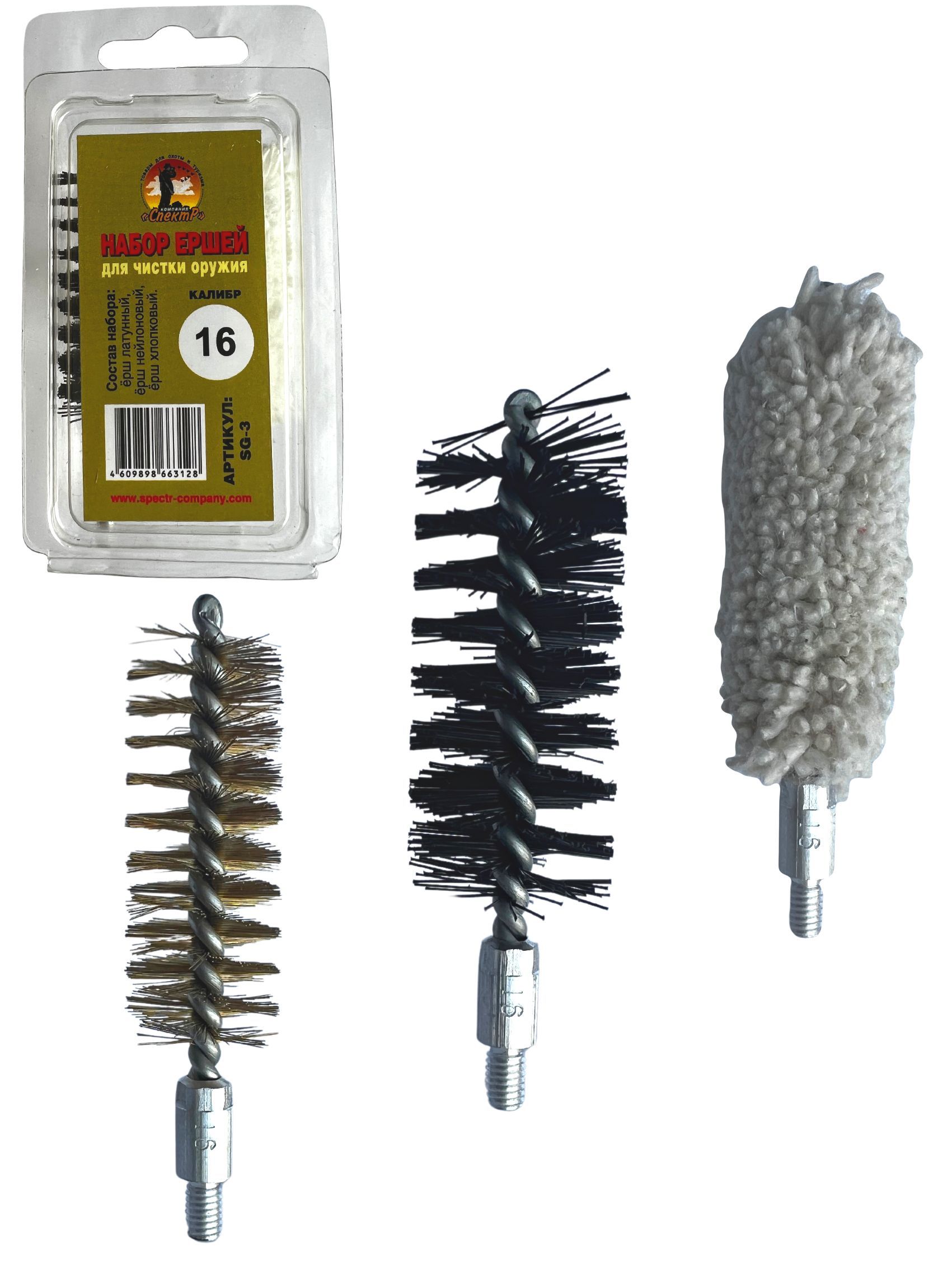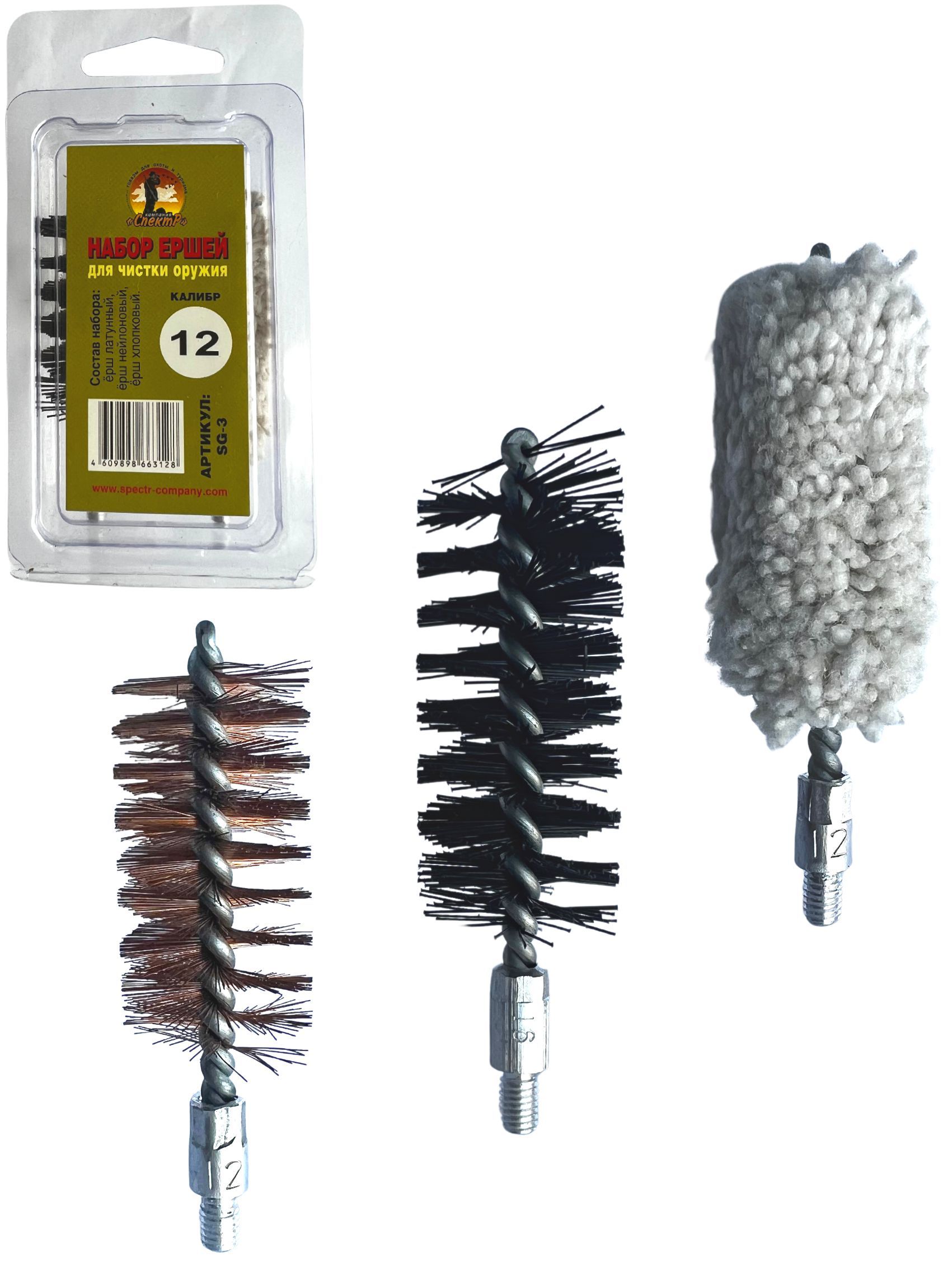 Набор ершей SG-3 – представляет собой комплект из 3х ершей для чистки гладкоствольного оружия, компактно размещенных в блистерную упаковку. Блистер многоразовый оснащен евро подвесом, что очень удобно при переносе или хранении. Изготовлен он из мягкого прозрачного пластика (полипропилена). Каждый ерш набора выполняет свою функцию: