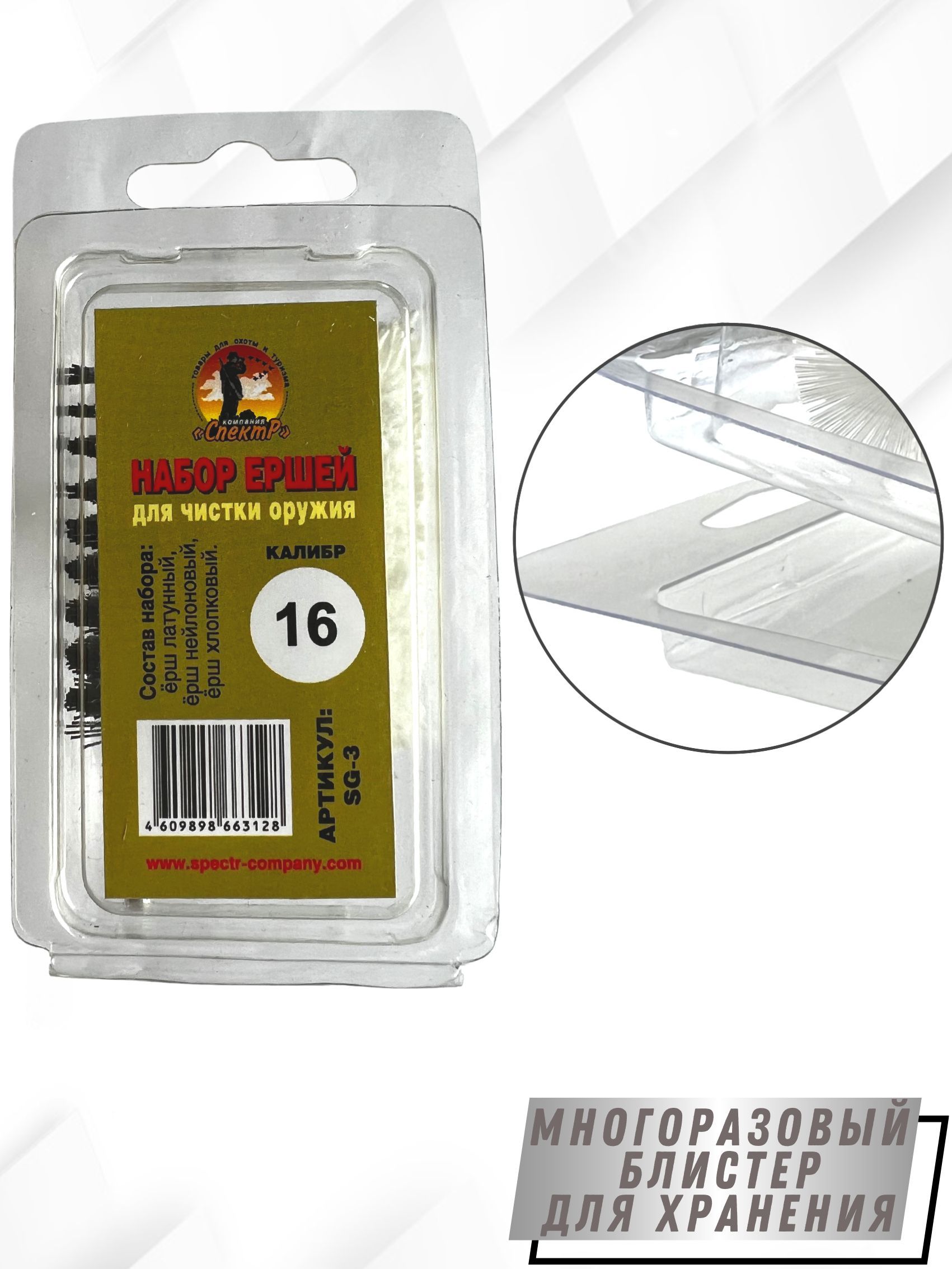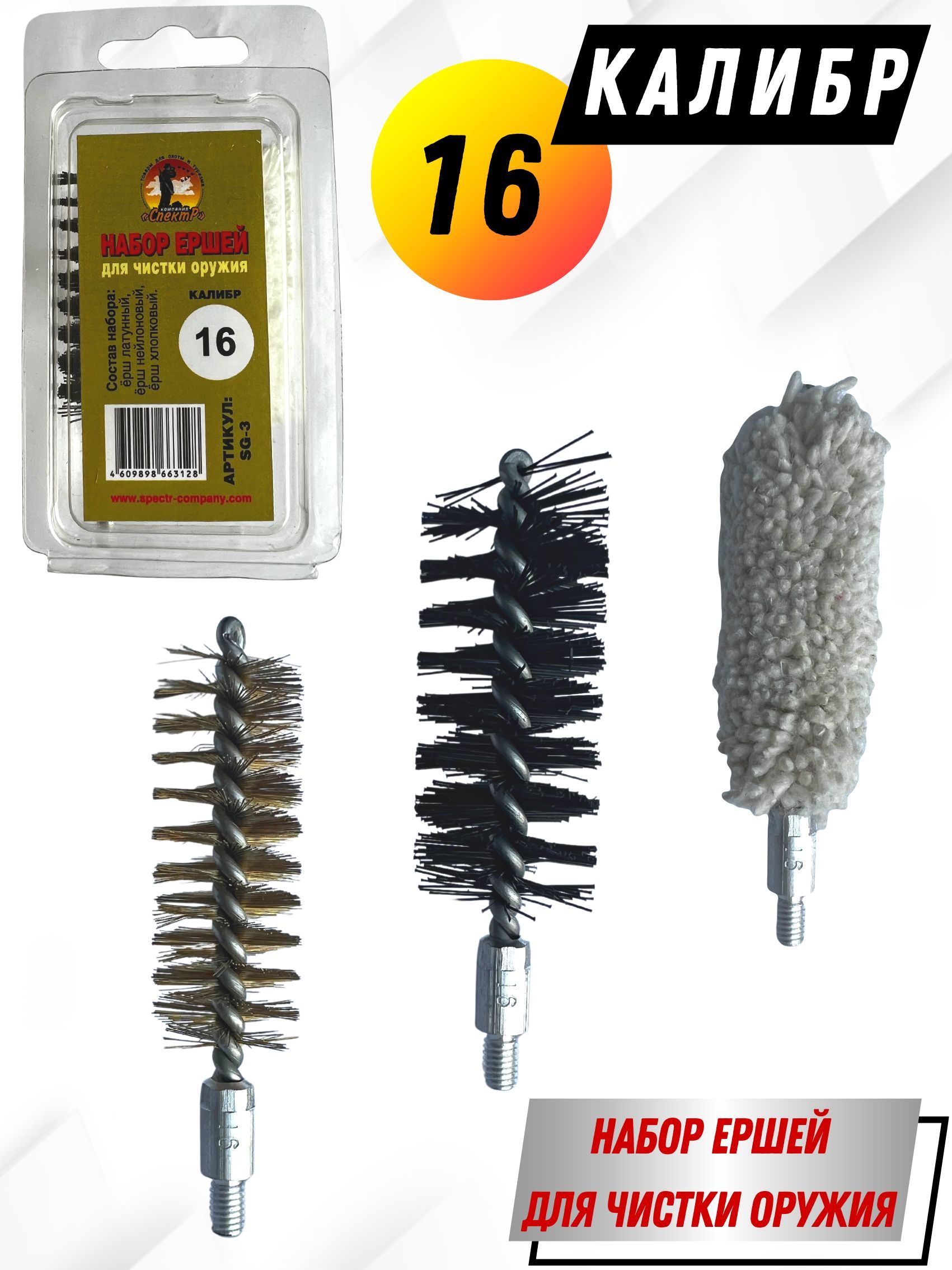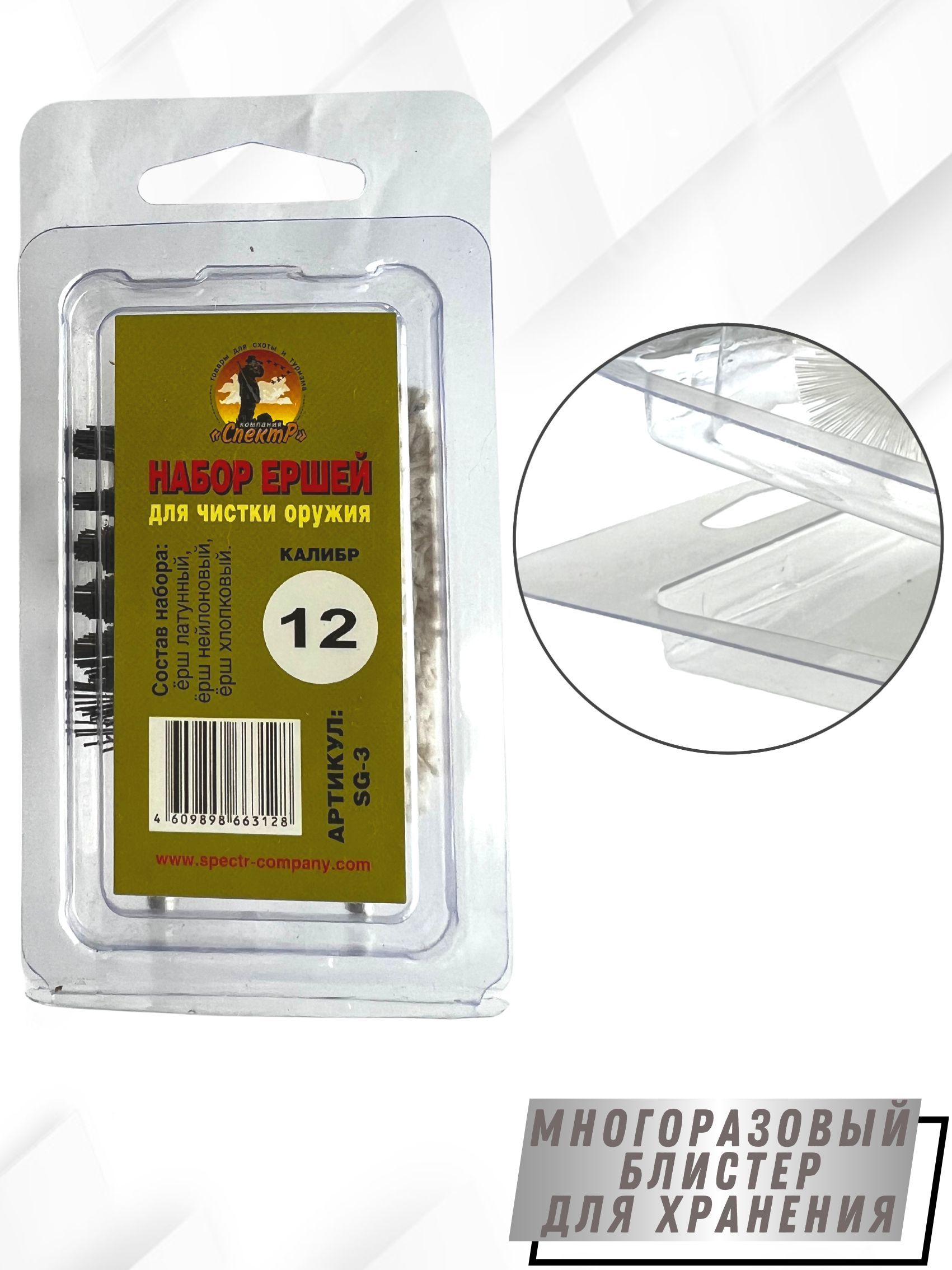 Набор ершей SG-3 – представляет собой комплект из 3х ершей для чистки гладкоствольного оружия, компактно размещенных в блистерную упаковку. Блистер многоразовый оснащен евро подвесом, что очень удобно при переносе или хранении. Изготовлен он из мягкого прозрачного пластика (полипропилена). Каждый ерш набора выполняет свою функцию: