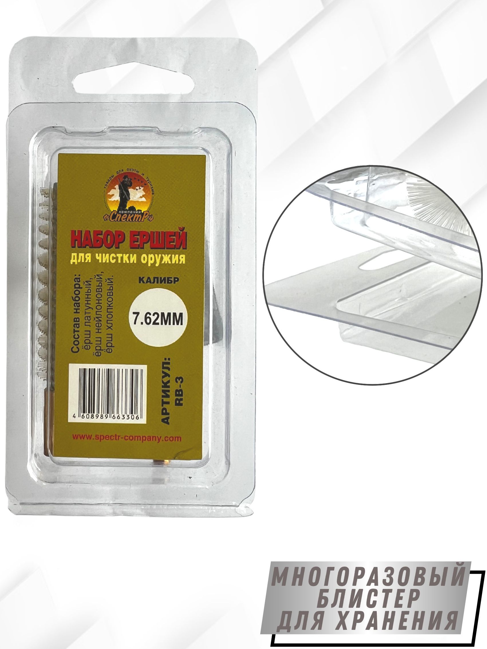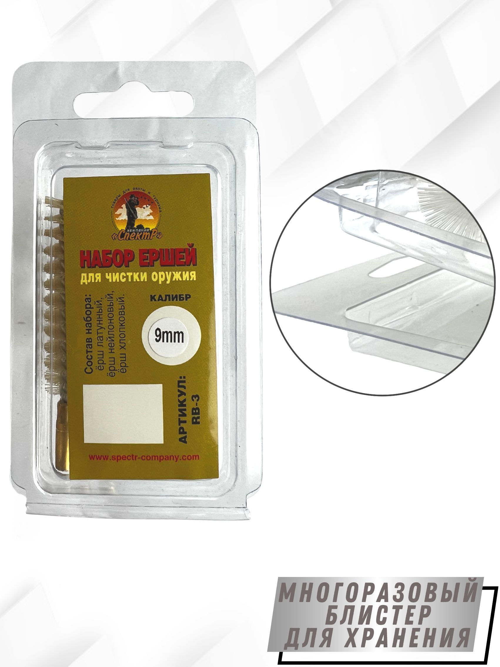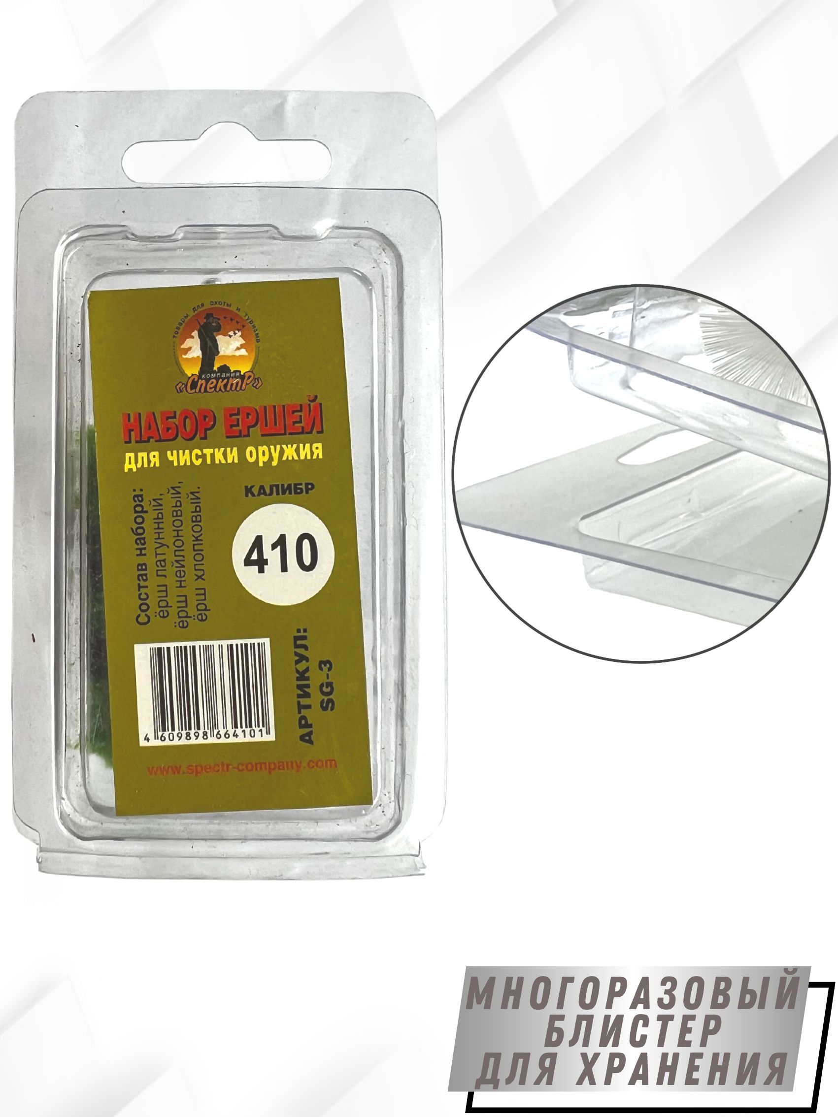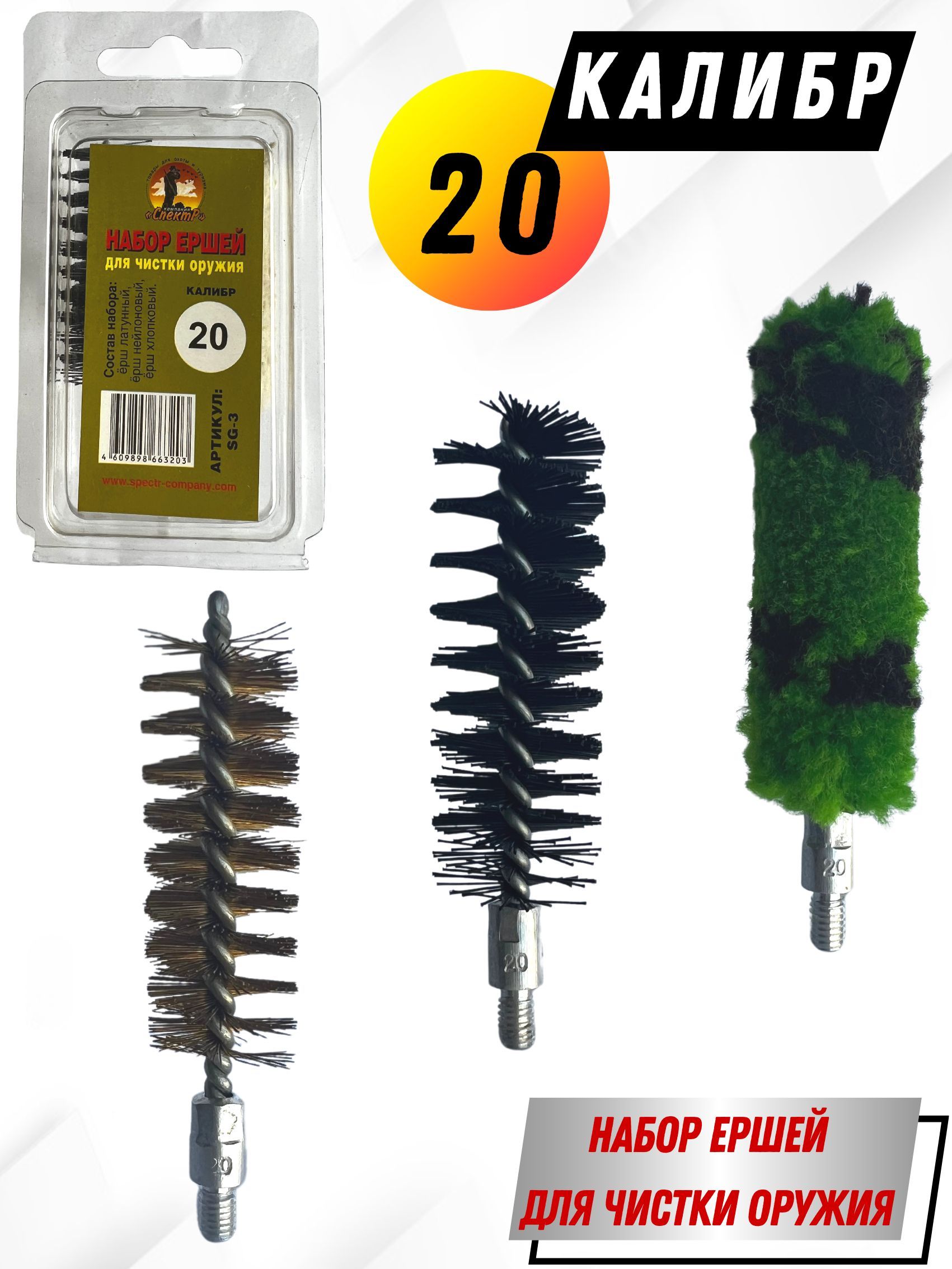 Набор ершей SG-3 – представляет собой комплект из 3х ершей для чистки гладкоствольного оружия, компактно размещенных в блистерную упаковку. Блистер многоразовый оснащен евро подвесом, что очень удобно при переносе или хранении. Изготовлен он из мягкого прозрачного пластика (полипропилена). Каждый ерш набора выполняет свою функцию: