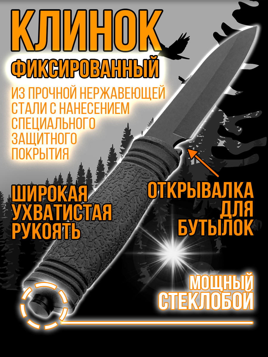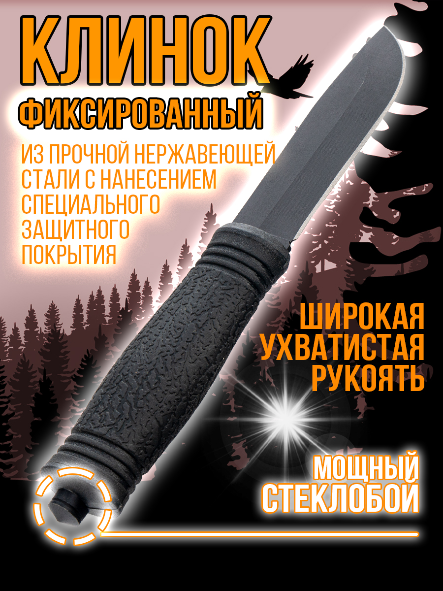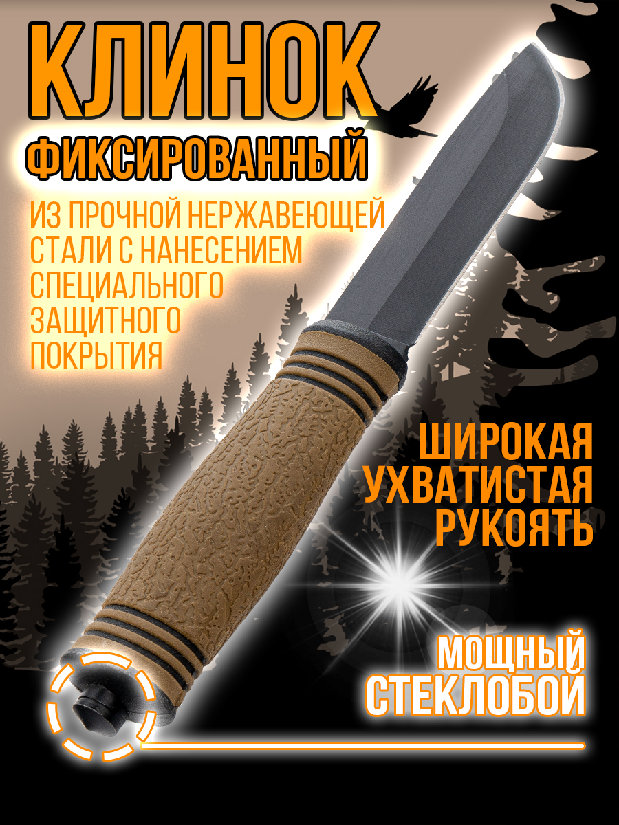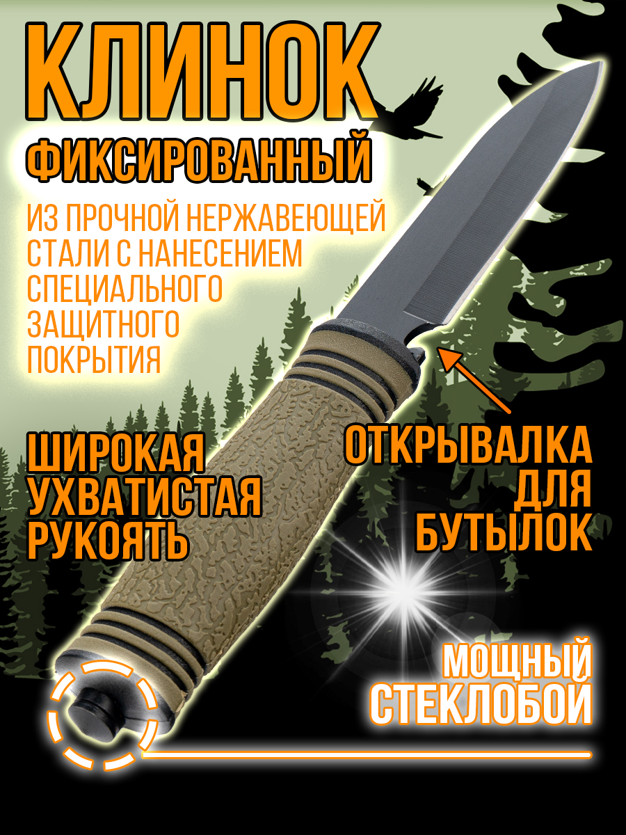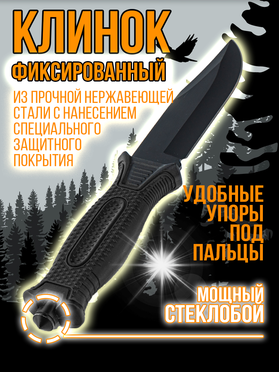 Модель 2958 – туристический, универсальный нож с фиксированным клинком по форме CLIP-POINT и стеклобоем. Клинок со скошенным к острию обухом, скос вогнутый. Сталь прочная, нержавеющая, износостойкая, окрашенная с нанесением рисунка. Легко и быстро поддается заточке, не боится коррозии. Пластиковая рукоять, с резиновой вставкой хорошо лежит в руке и не скользит. Стеклобой послужит хорошим помощником в непредвиденных ситуациях не только для обычных пользователей, но и для профессионалов спасателей. Пластиковые ножны с креплением под ремень, надежно фиксируют нож. Хорошо подойдет для хозяйственно бытовых нужд, кухонных работ, на пикнике, в лесу, на воде. Не один турист, охотник, рыбак не обойдется без ножа, который является предметом снаряжения и пригодится на все случаи жизни. Броский, вызывающий внешний вид, послужит хорошим подарком, для поклонников активного образа жизни.