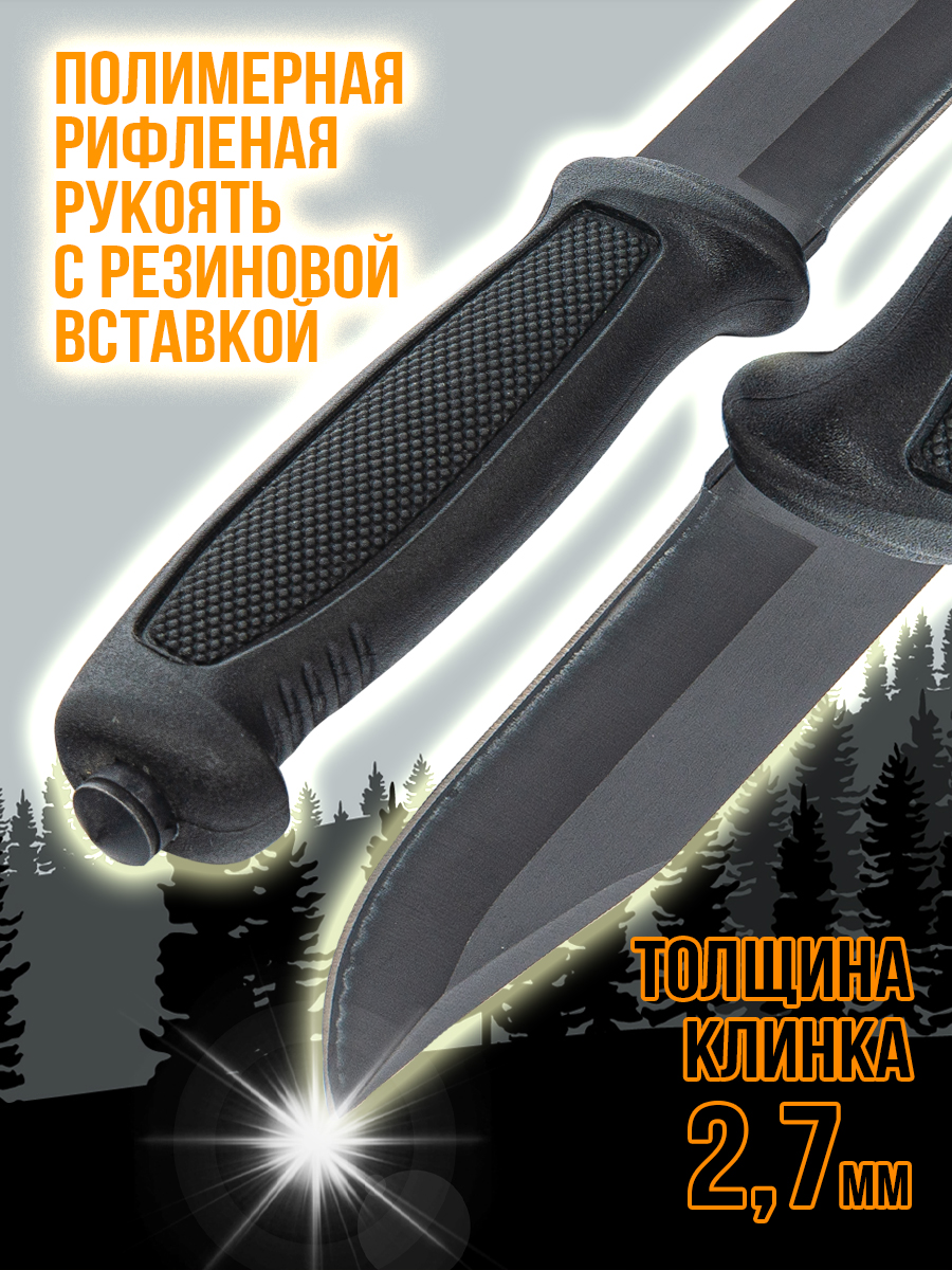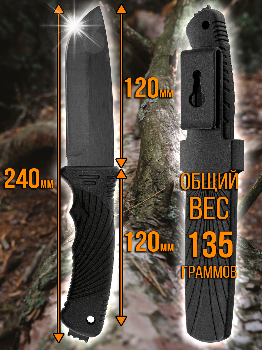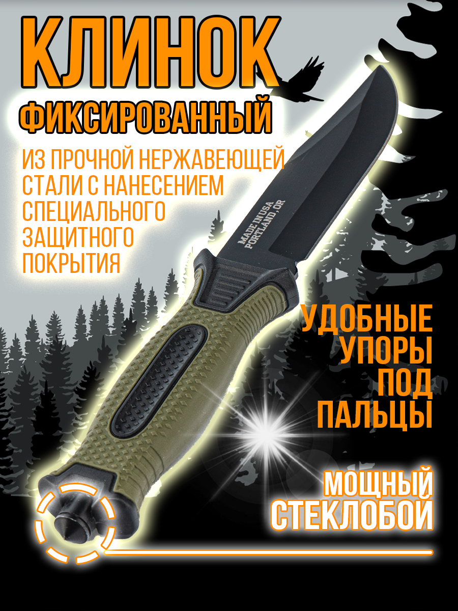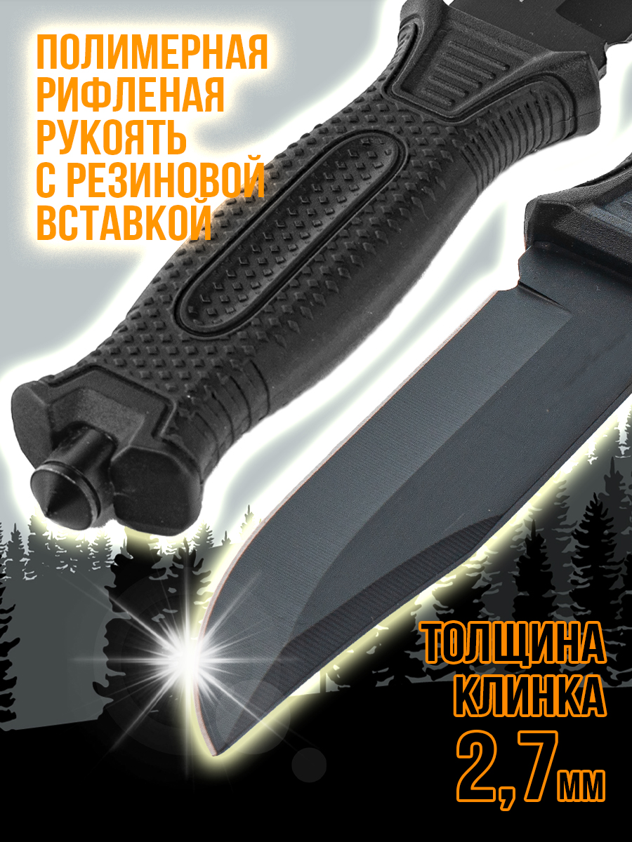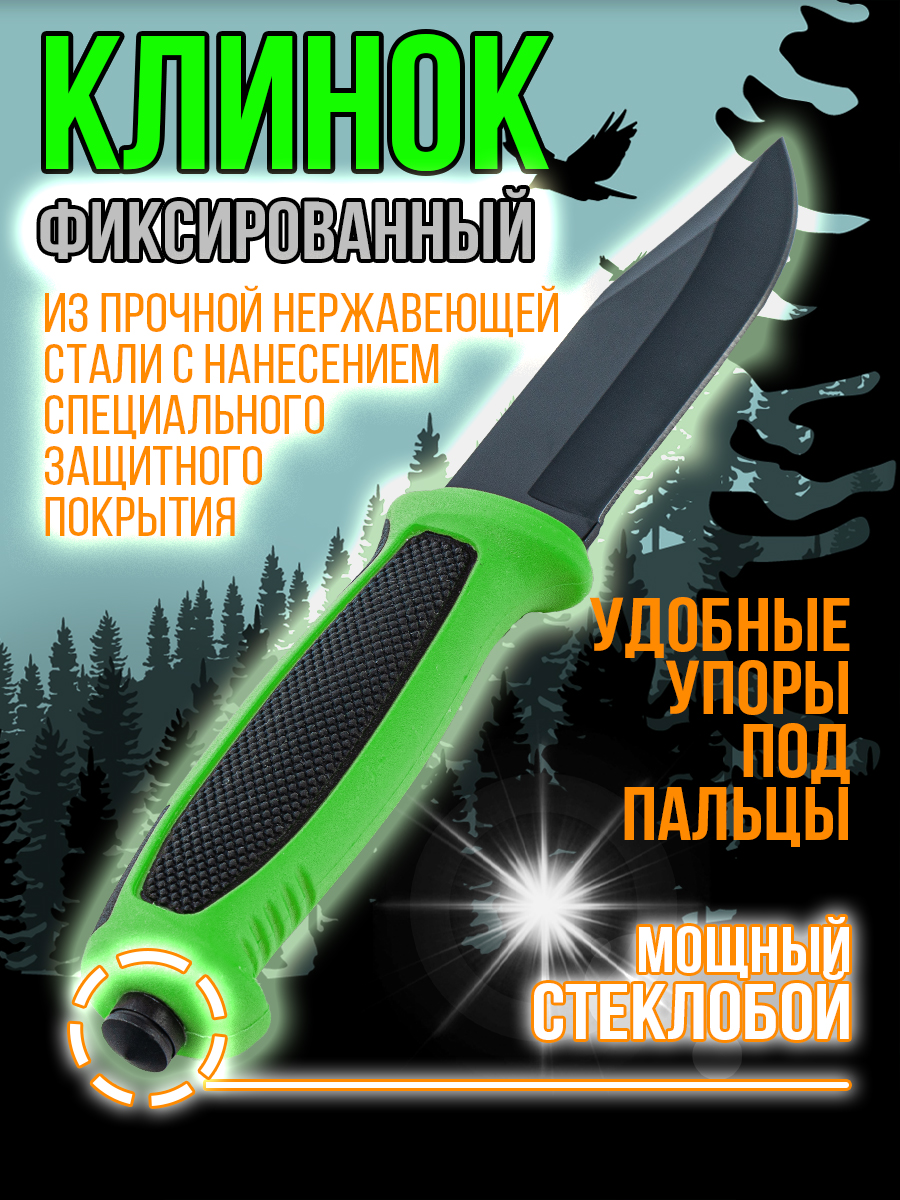 Модель 2958 – туристический, универсальный нож с фиксированным клинком по форме CLIP-POINT и стеклобоем. Клинок со скошенным к острию обухом, скос вогнутый. Сталь прочная, нержавеющая, износостойкая, окрашенная с нанесением рисунка. Легко и быстро поддается заточке, не боится коррозии. Пластиковая рукоять, с резиновой вставкой хорошо лежит в руке и не скользит. Стеклобой послужит хорошим помощником в непредвиденных ситуациях не только для обычных пользователей, но и для профессионалов спасателей. Пластиковые ножны с креплением под ремень, надежно фиксируют нож. Хорошо подойдет для хозяйственно бытовых нужд, кухонных работ, на пикнике, в лесу, на воде. Не один турист, охотник, рыбак не обойдется без ножа, который является предметом снаряжения и пригодится на все случаи жизни. Броский, вызывающий внешний вид, послужит хорошим подарком, для поклонников активного образа жизни.