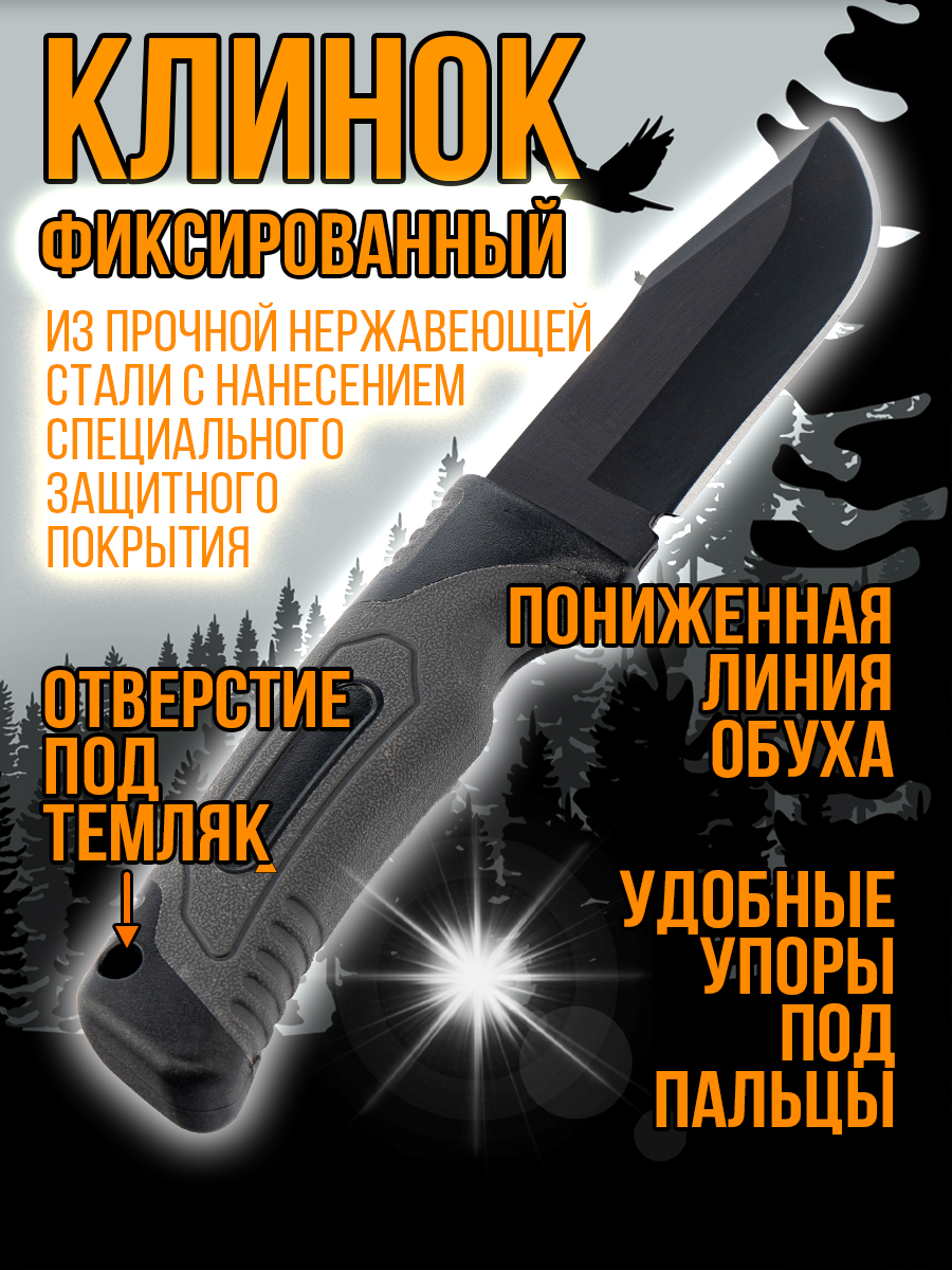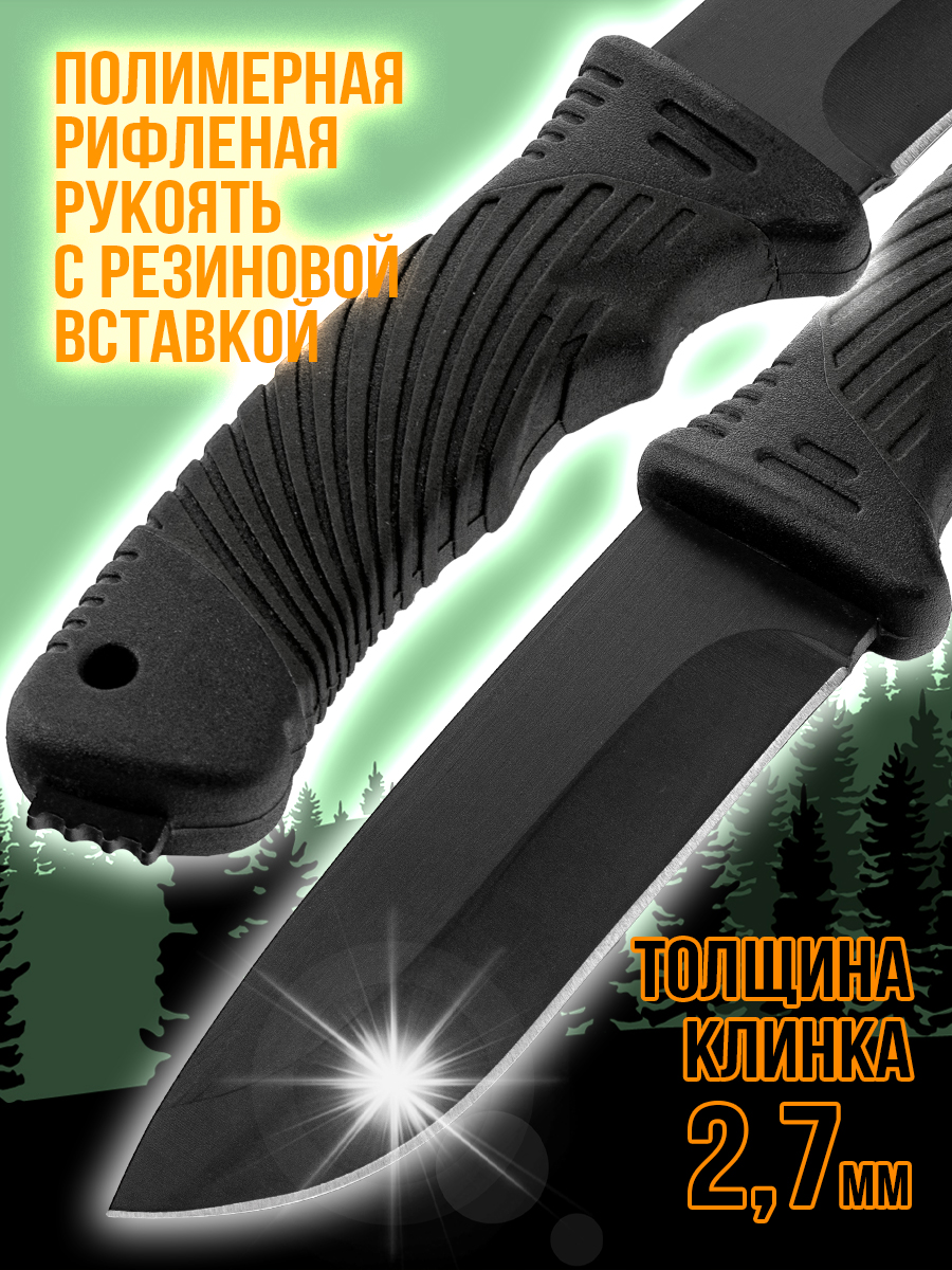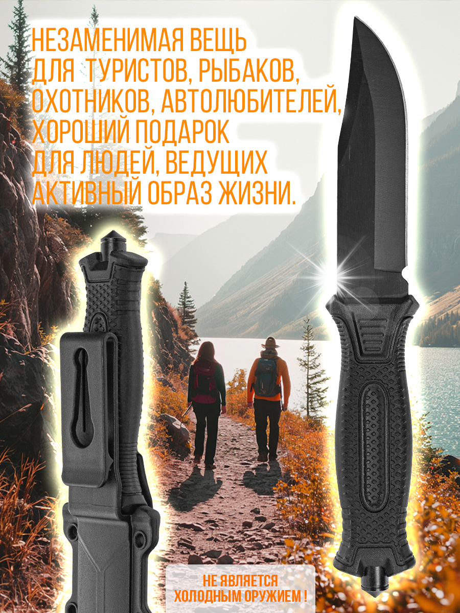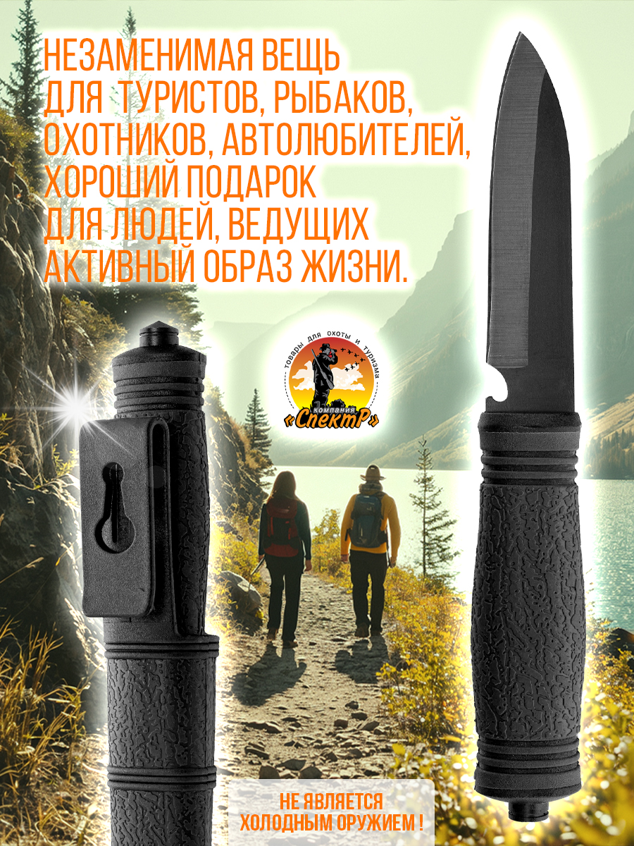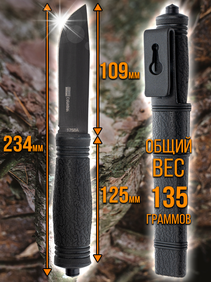 Модель 2958 – туристический, универсальный нож с фиксированным клинком по форме CLIP-POINT и стеклобоем. Клинок со скошенным к острию обухом, скос вогнутый. Сталь прочная, нержавеющая, износостойкая, окрашенная с нанесением рисунка. Легко и быстро поддается заточке, не боится коррозии. Пластиковая рукоять, с резиновой вставкой хорошо лежит в руке и не скользит. Стеклобой послужит хорошим помощником в непредвиденных ситуациях не только для обычных пользователей, но и для профессионалов спасателей. Пластиковые ножны с креплением под ремень, надежно фиксируют нож. Хорошо подойдет для хозяйственно бытовых нужд, кухонных работ, на пикнике, в лесу, на воде. Не один турист, охотник, рыбак не обойдется без ножа, который является предметом снаряжения и пригодится на все случаи жизни. Броский, вызывающий внешний вид, послужит хорошим подарком, для поклонников активного образа жизни.