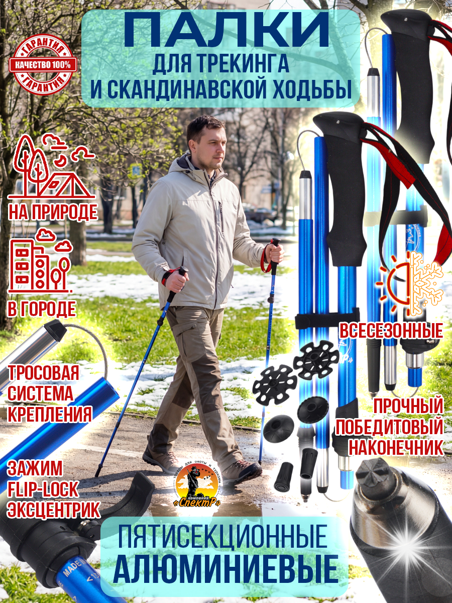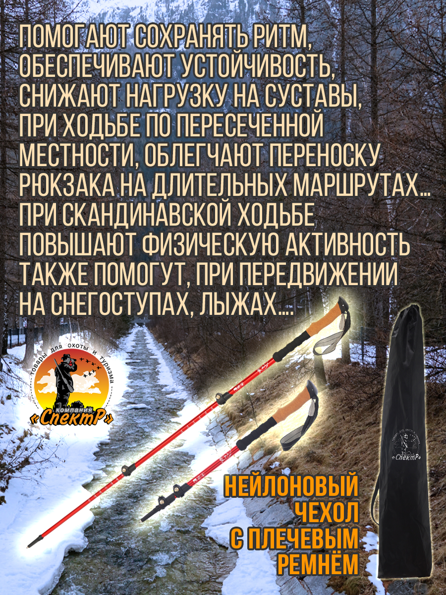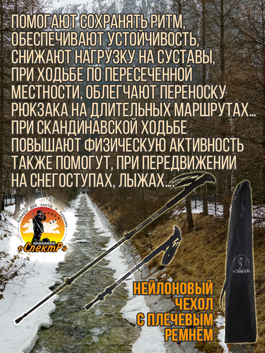 - комплектация: Трекинговые палки 2шт, 3 пары насадок «САПОЖОК», малое кольцо, большое кольцо, чехол для переноса).