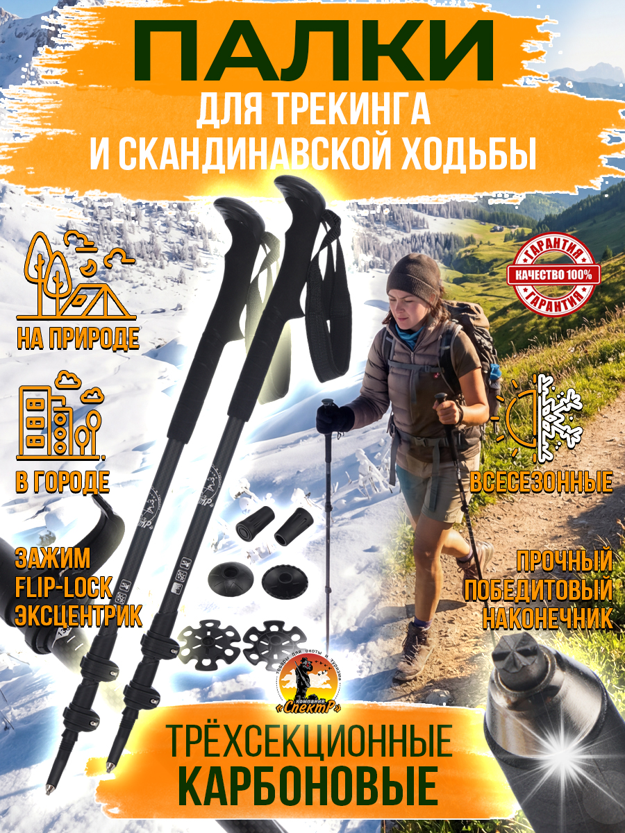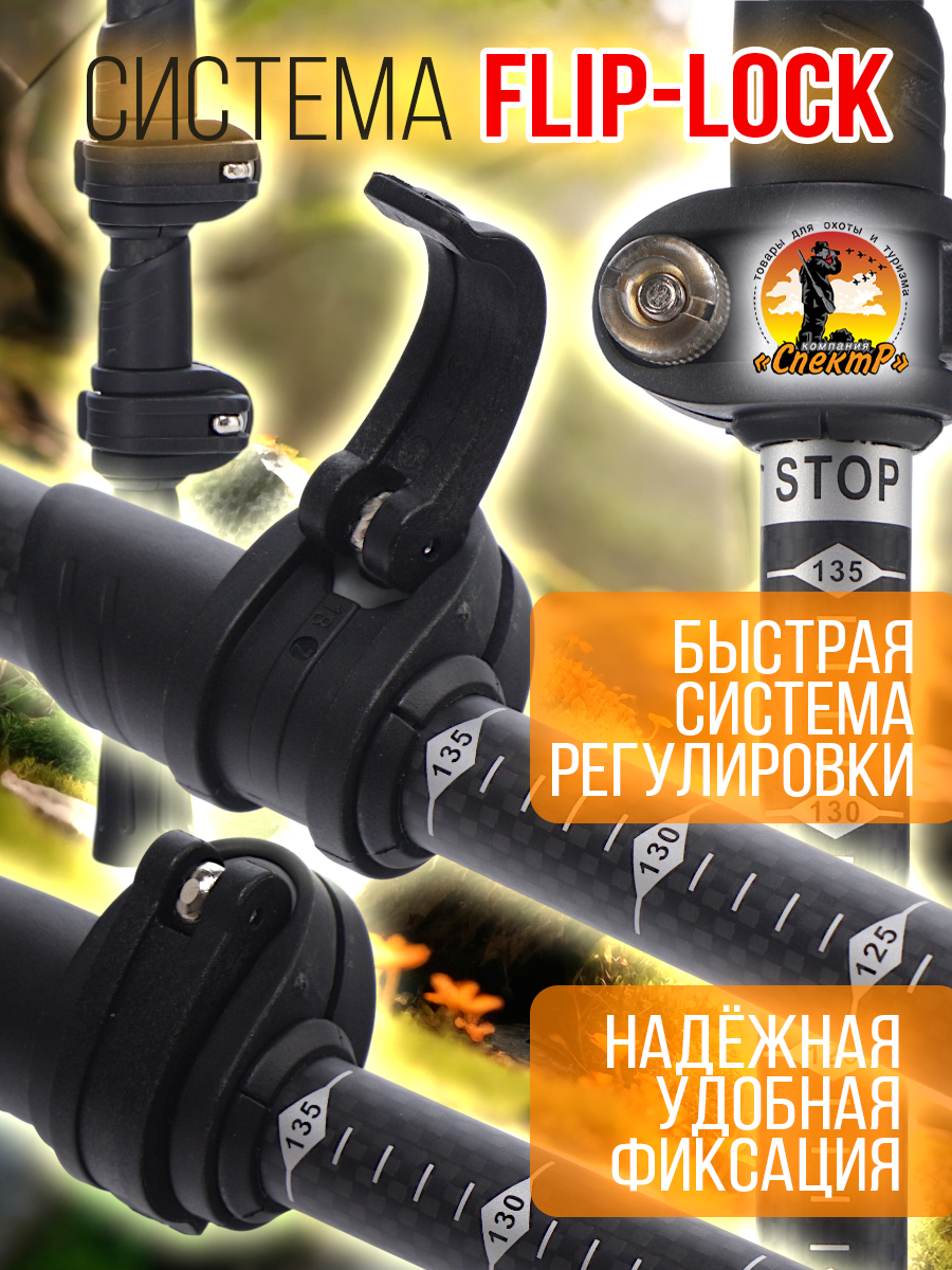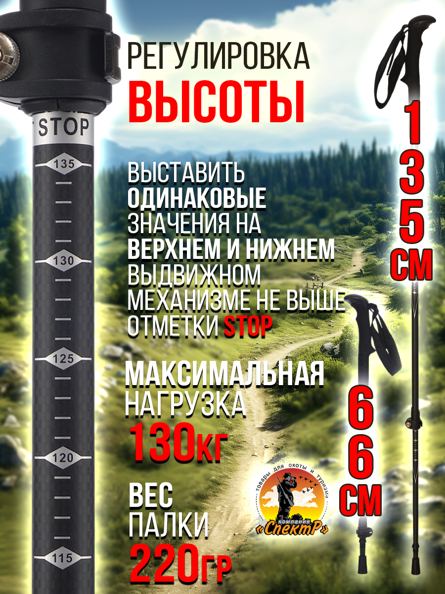 В основе материала трубки Карбон 3К (углеродистое волокно), которое придает исключительную прочность при минимальном весе и отлично подходит для спортивных целей. Длина в сложенном виде 66см. Регулируемая длина секций от 66 до135см, что обеспечивает рост до 190см и максимальную нагрузку до130кг. Для облегчения выставления необходимой длины под рост или условия маршрута, на секциях размечена линейка (с шагом 5см) от 110 -135см и линией СТОП. Важно за данную линию не выходить, иначе конструкция не выдержат нагрузки. Эксцентриковый FLIP LOCK или QUICKLOCK фиксатор из современного ударопрочного, морозостойкого пластика, позволяет быстро менять высоту даже в перчатках. Победитовый металлический (вольфрамовый) наконечник, предназначен для использования на грунтовых и каменистых почвах. Победит исключает истирание даже в суровых условиях и гарантирует долгий срок службы. Для использования в разных условиях и выполнения поставленных задач при ходьбе, в комплекте с трекинговыми полками идут 3 пары насадок: