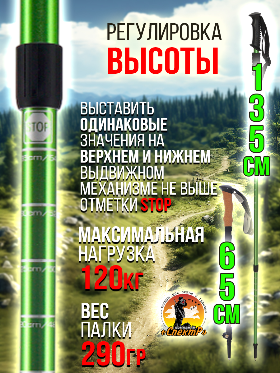 - длина в сложенном- разложенном виде/ макс нагрузка/ вес 1палки:66-135см/ до130кг/220гр.