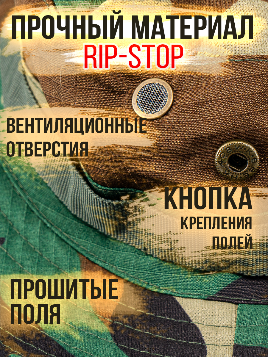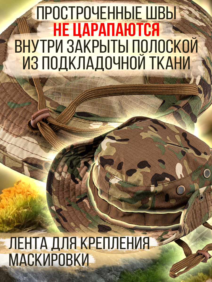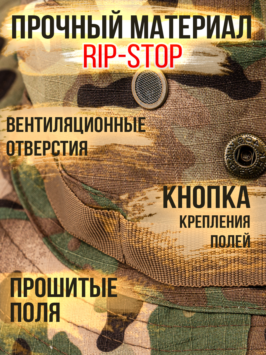 Панама в стиле MILITARY – фабричная классическая модель с широкими полями и усилительной лентой для дополнительного крепления маскировочной растительности. Универсальная – подходит для любого пола и возраста. Легкая - не стесняет движений. Удобная – легко складывается. Компактная – не займет много места в рюкзаке. Предназначена для ношения в теплое время года, от весны до осени. Обеспечит надежную защиту от солнца, дождя и ветра. Хорошо дышит, предотвращает перегрев головы и не вызывает аллергических реакций. Камуфляжный дизайн – идеально сливается с природной средой, что особенно важно для охотников и туристов. Основа достаточно глубокая, с качественной прострочкой швов, которые не царапаются, а внутри закрыты дополнительной тканью. По бокам предусмотрены вентиляционные отверстия (люверсы), обеспечивающие циркуляцию воздуха. Поля панамы широкие, усиленны подкладкой из бязи, для придачи правильной формы и объема. Для ношения с отворотом, с боков расположена кнопка, которая фиксирует поля панамы к основе, что позволяет регулировать форму головного убора в зависимости от предпочтений пользователя. Размер универсальный, посадка удобная, с окружностью головы до 60см. Панама оснащена регулируемым шнурком, который позволяет закрепить головной убор на голове и надежно удерживает панаму в ветреную погоду. Ткань смесовая Рипстон (35% хлопок, 65% полиэстер) - легкая, прочная, износостойкая. За счет переплетения нитей и сетчатой текстуры смесовый состав обеспечивает устойчивость к механическим повреждениям и достойный внешний вид. При разрыве ткань не расползается, что дает возможность легко заделать место повреждения. Панама отлично впишется к армейской, тактической, туристической экипировке, получите стильный функциональный и надежный головной убор, который станет незаменимым аксессуаром в летний период и послужит отличным подарком мужчине, парню, мужу на день рождение, 23 февраля, 9 мая, новый год или любой другой праздник.