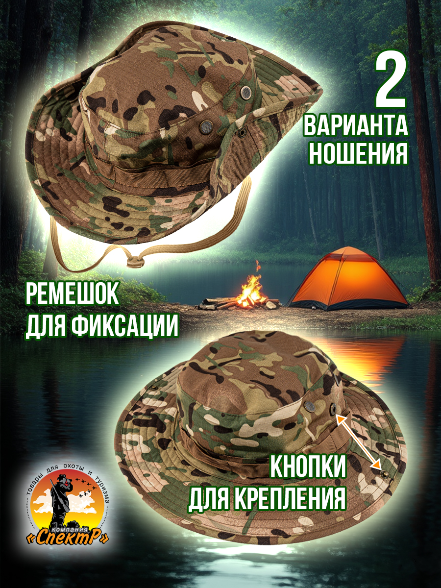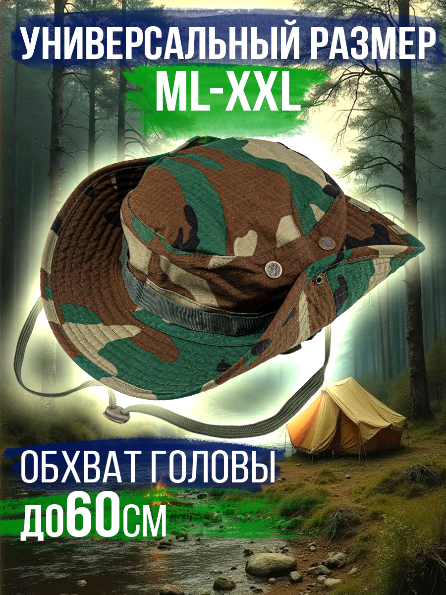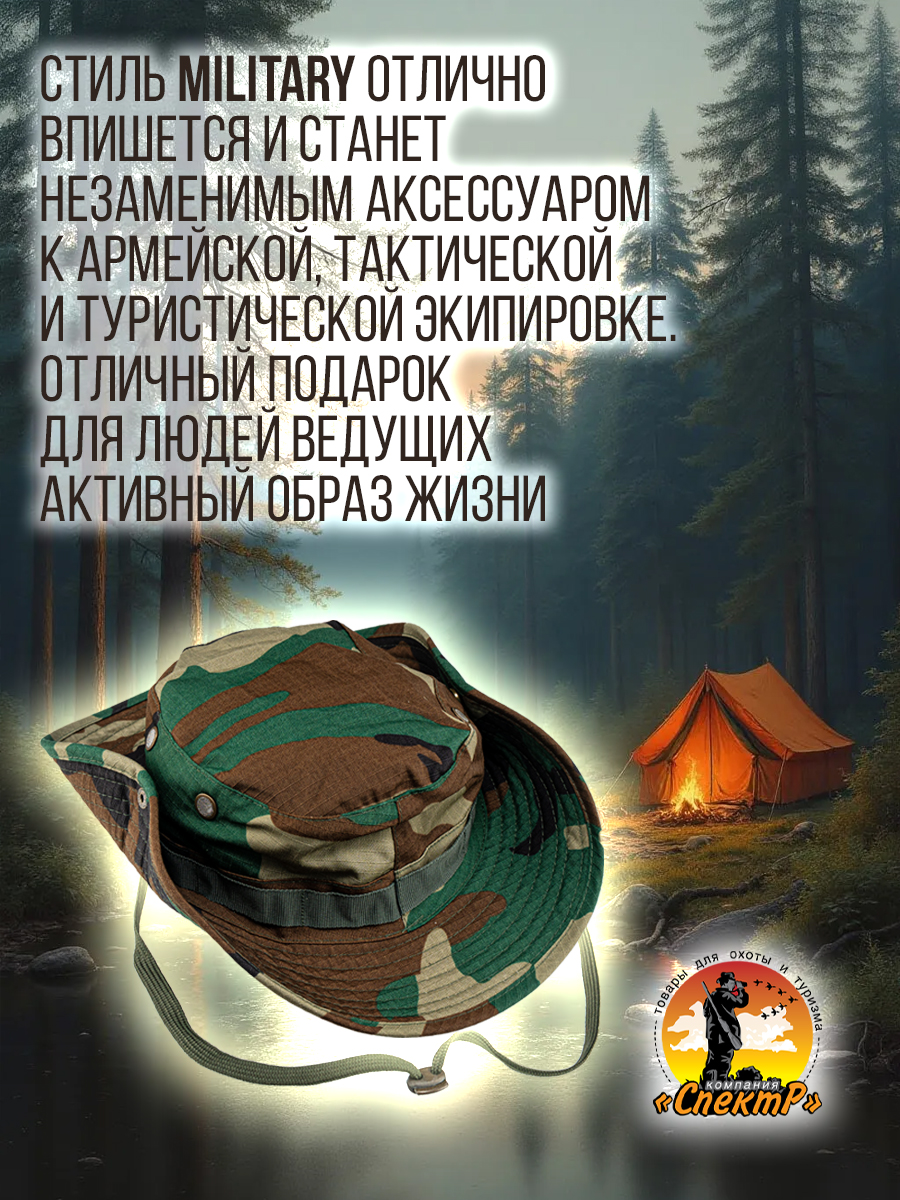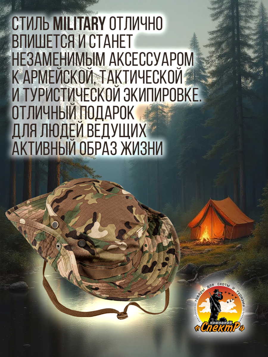 Панама в стиле MILITARY – фабричная классическая модель с широкими полями и усилительной лентой для дополнительного крепления маскировочной растительности. Универсальная – подходит для любого пола и возраста. Легкая - не стесняет движений. Удобная – легко складывается. Компактная – не займет много места в рюкзаке. Предназначена для ношения в теплое время года, от весны до осени. Обеспечит надежную защиту от солнца, дождя и ветра. Хорошо дышит, предотвращает перегрев головы и не вызывает аллергических реакций. Камуфляжный дизайн – идеально сливается с природной средой, что особенно важно для охотников и туристов. Основа достаточно глубокая, с качественной прострочкой швов, которые не царапаются, а внутри закрыты дополнительной тканью. По бокам предусмотрены вентиляционные отверстия (люверсы), обеспечивающие циркуляцию воздуха. Поля панамы широкие, усиленны подкладкой из бязи, для придачи правильной формы и объема. Для ношения с отворотом, с боков расположена кнопка, которая фиксирует поля панамы к основе, что позволяет регулировать форму головного убора в зависимости от предпочтений пользователя. Размер универсальный, посадка удобная, с окружностью головы до 60см. Панама оснащена регулируемым шнурком, который позволяет закрепить головной убор на голове и надежно удерживает панаму в ветреную погоду. Ткань смесовая Рипстон (35% хлопок, 65% полиэстер) - легкая, прочная, износостойкая. За счет переплетения нитей и сетчатой текстуры смесовый состав обеспечивает устойчивость к механическим повреждениям и достойный внешний вид. При разрыве ткань не расползается, что дает возможность легко заделать место повреждения. Панама отлично впишется к армейской, тактической, туристической экипировке, получите стильный функциональный и надежный головной убор, который станет незаменимым аксессуаром в летний период и послужит отличным подарком мужчине, парню, мужу на день рождение, 23 февраля, 9 мая, новый год или любой другой праздник.