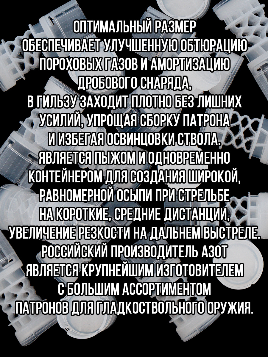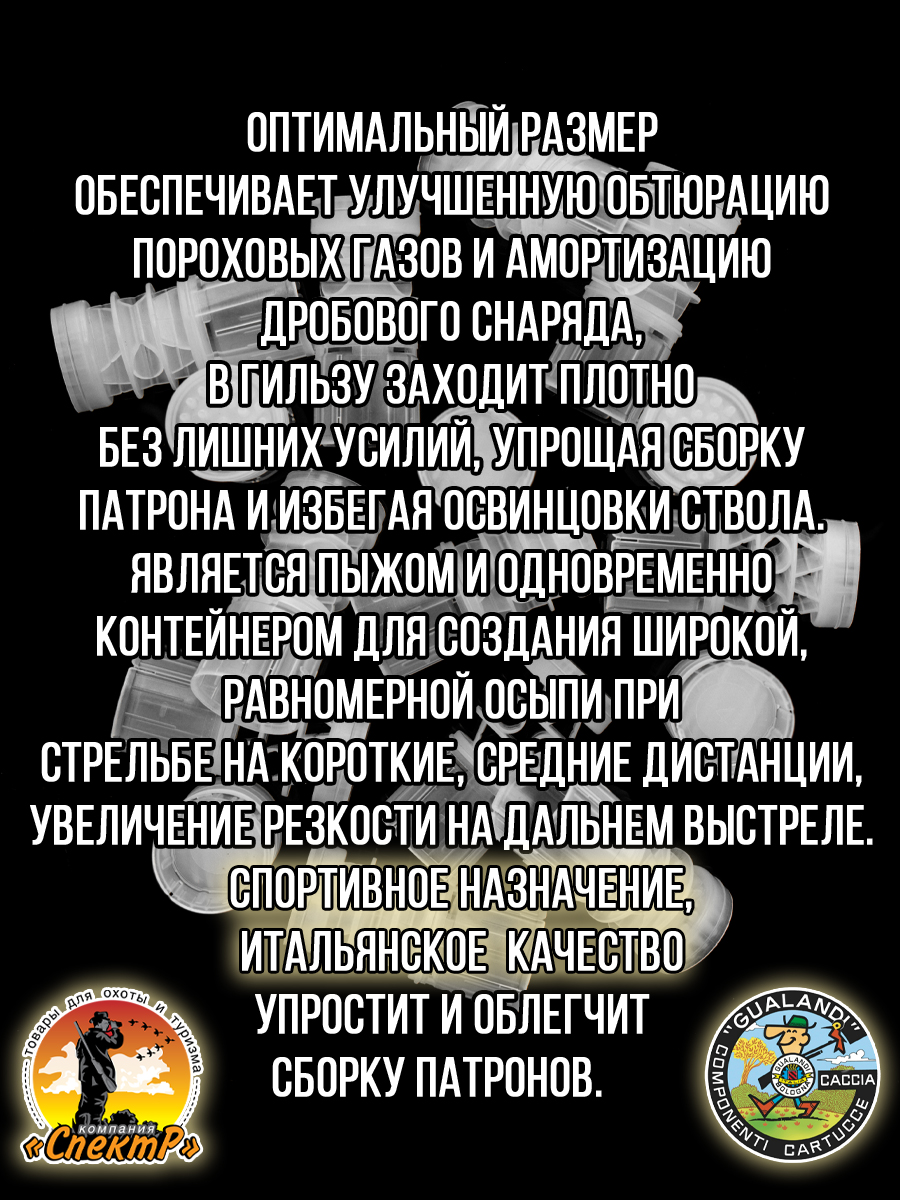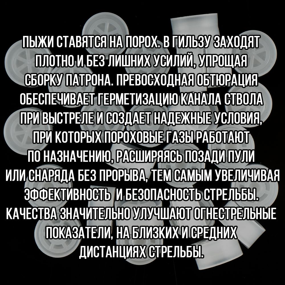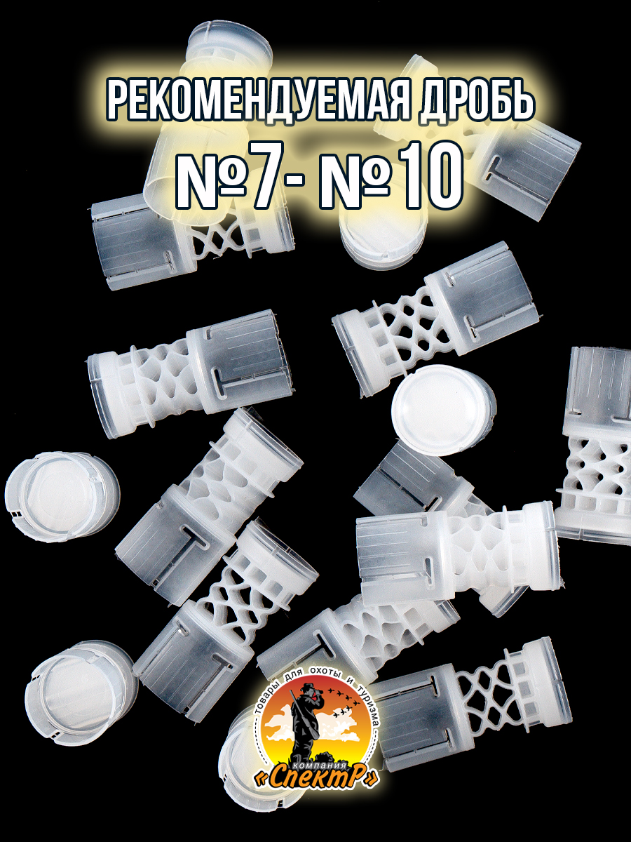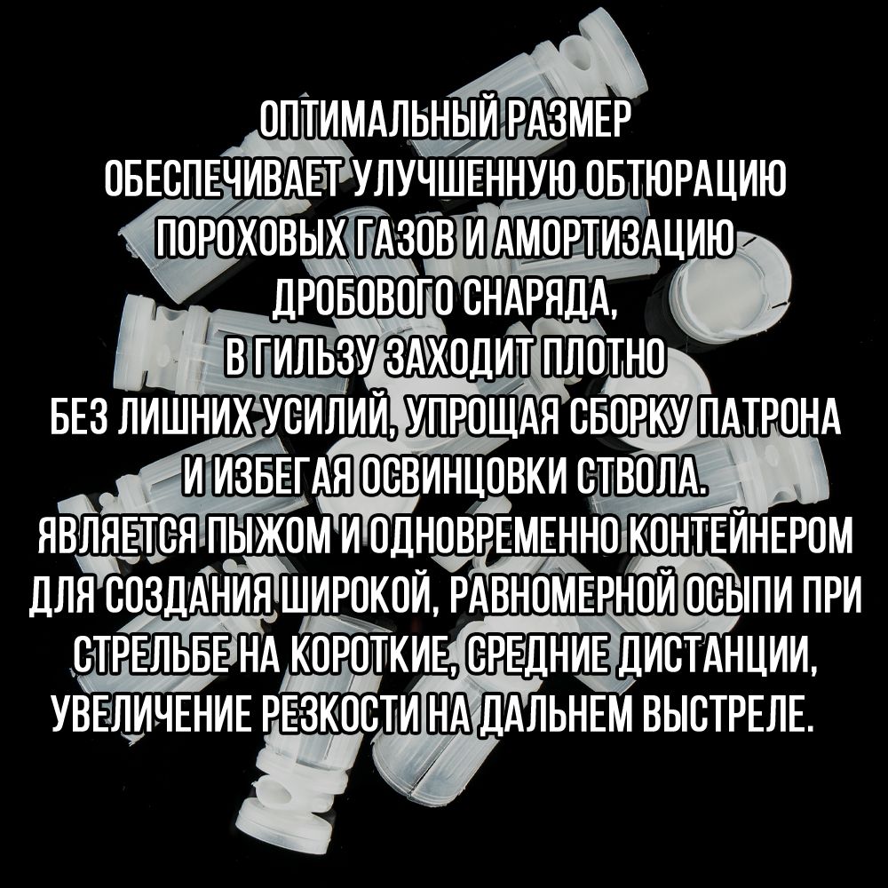 - толщина стенок пыжа/ вес изделия: 1мм/ 1,9гр.- рекомендуемая масса дроби: 13,5гр.