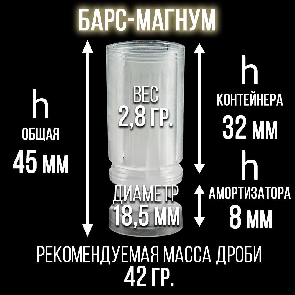 Пыж-контейнер «Барс» с обтюратором – изделие полиэтиленовое, предназначенное для снаряжения в пластиковые гильзы дробовых, картечных или пулевых охотничьих патронов гладкоствольного оружия 20 калибра. Рекомендованная вместимость дроби 13,5гр. Отличительной особенность является подобранный специалистами оптимальный размер, что обеспечивает улучшенную обтюрацию пороховых газов и амортизацию дробового снаряда. В пластиковую гильзу заходит плотно и без лишних усилий, упрощая сборку патрона и избегая освинцовку ствола. Является пыжом и одновременно контейнером (выбранного вами снаряда), для создания широкой, равномерной осыпи при стрельбе на короткие и средние дистанции или увеличении резкости и дальности выстрела на дальние расстояния.