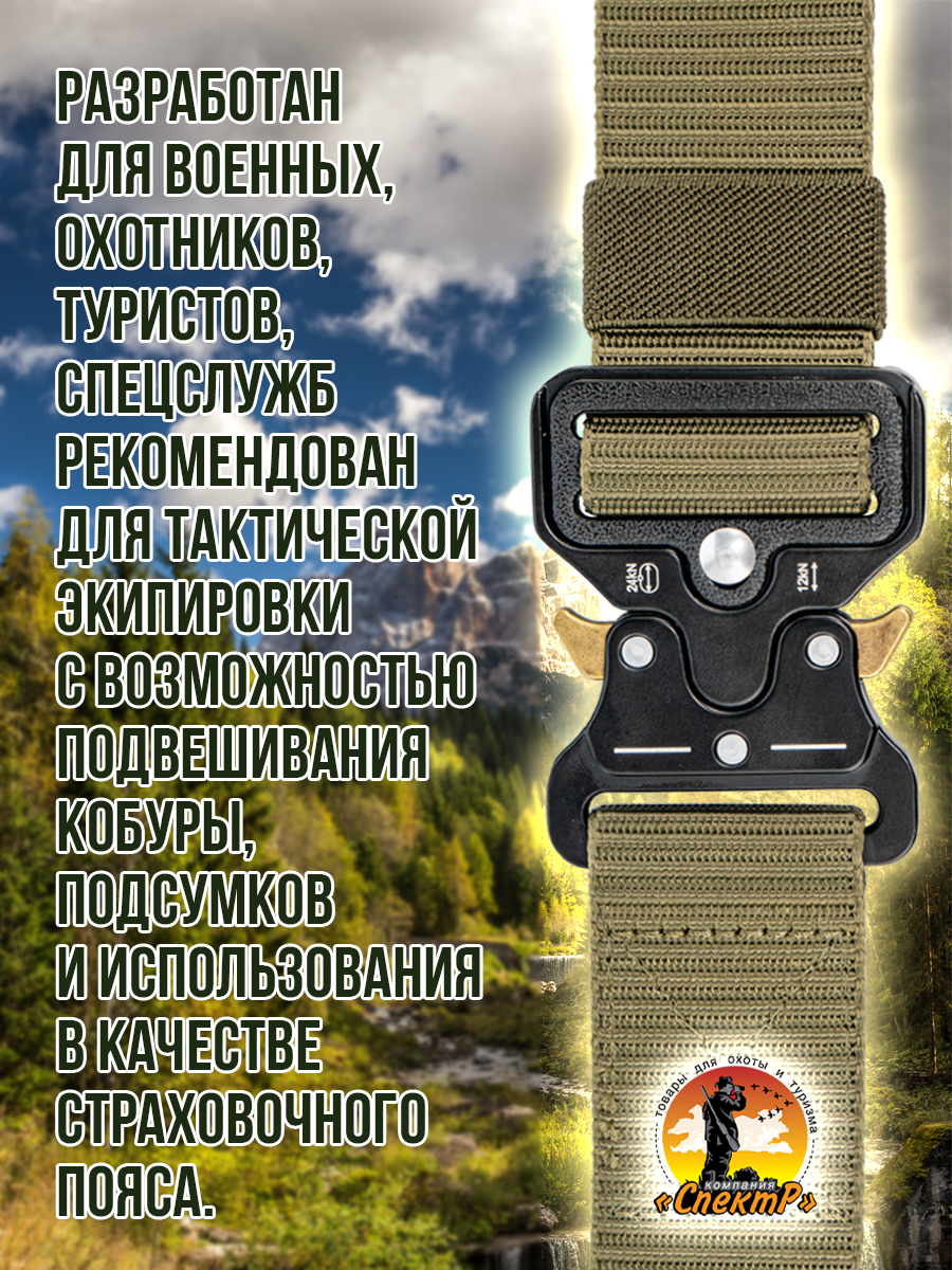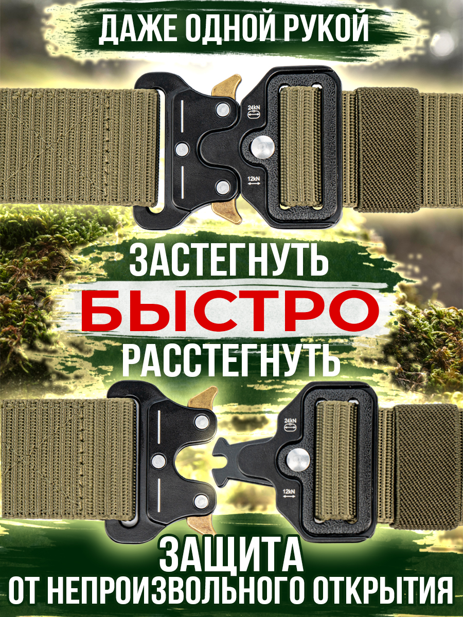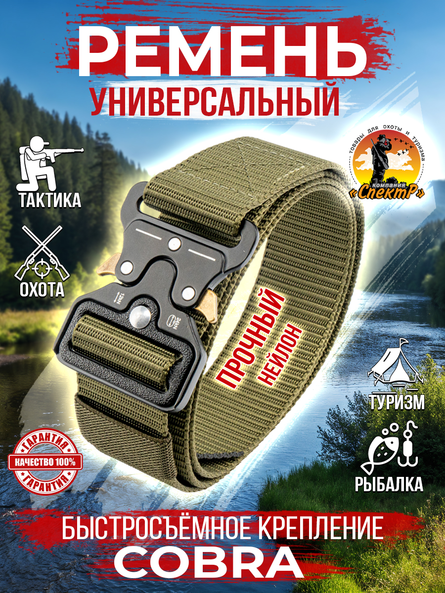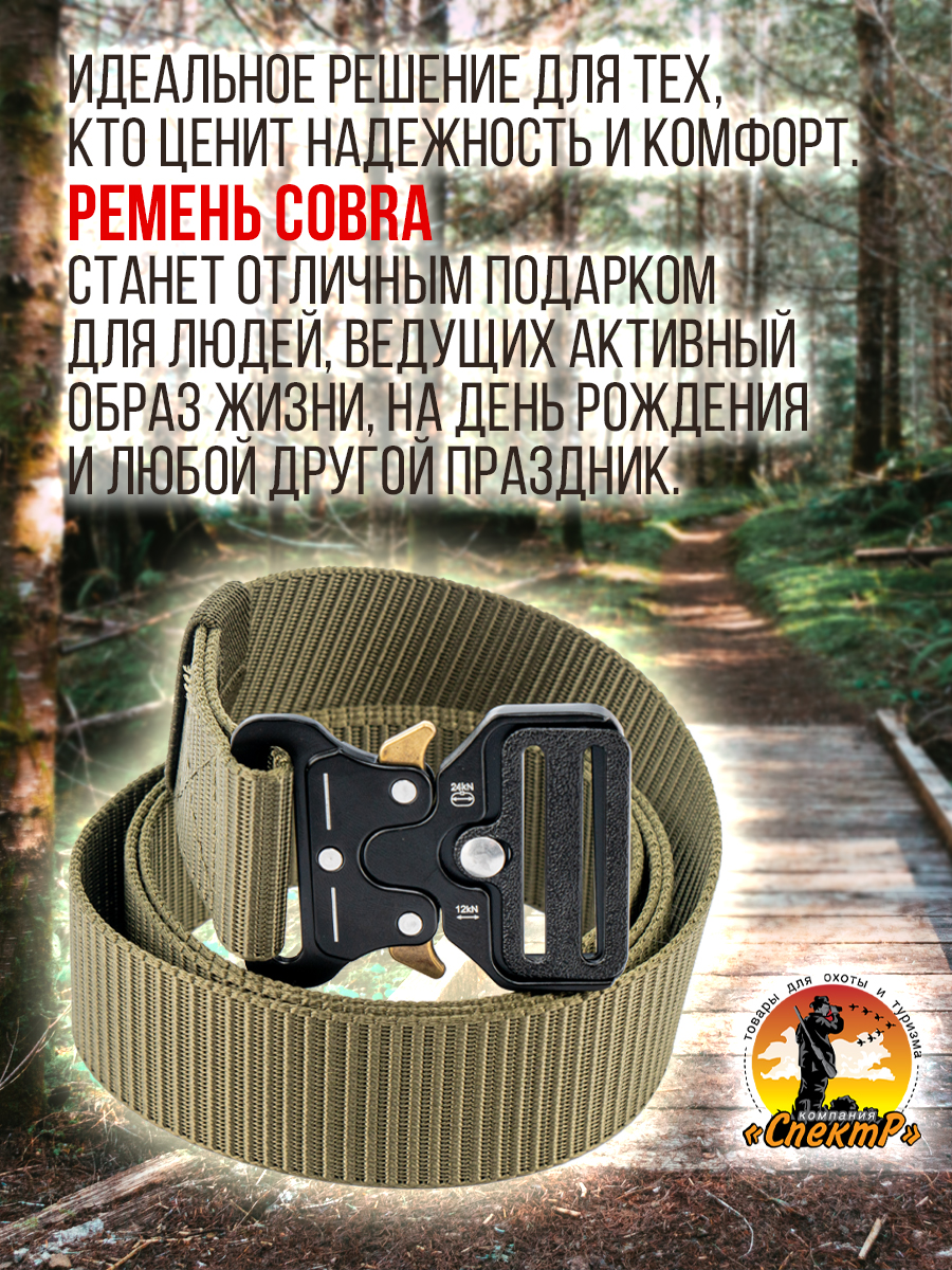 Ремень COBRA - прочный универсальный нейлоновый поясной аксессуар с металлической автоматической пряжкой, с типом быстросъемного крепления (карабин). Пряжка не магнитится, что существенно облегчает прохождение через металлорамку. Ремень разработан для военных, охотников, туристов, спецслужб, спортсменов и рекомендован для тактической экипировки с возможностью подвешивания на него различных предметов: кобура, подсумки или другого необходимого снаряжения и также использовать в качестве страховочного пояса. Хорошо зарекомендовал себя среди любителей активного отдыха: пейнбол, страйкбол, скейтборд, спортивный велосипед, самокат, ролики, лыжи. Благодаря оригинальному дизайну, данная модель универсальна и применима для экстремального и повседневного использования. Подойдет как мужскому, так и женскому полу. Красиво и стильно смотрится на джинсах, слаксах, брюках, шортах, на одежде в стиле кантри, милитари, мультикам, мох. Можно носить с униформой, камуфляжем в стиле кантри, милитари, мультикам, мох.
