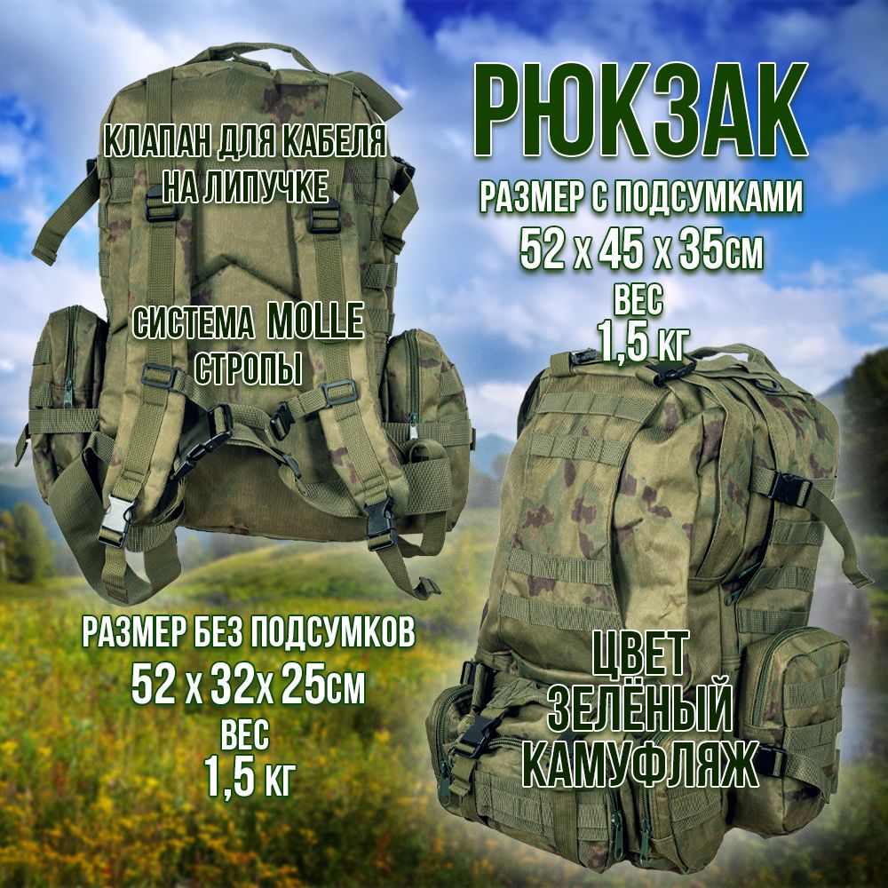 - размер рюкзака с подсумками/ без: Высота 52см х Ширина от 45/32см х Глубина от 35-25см.