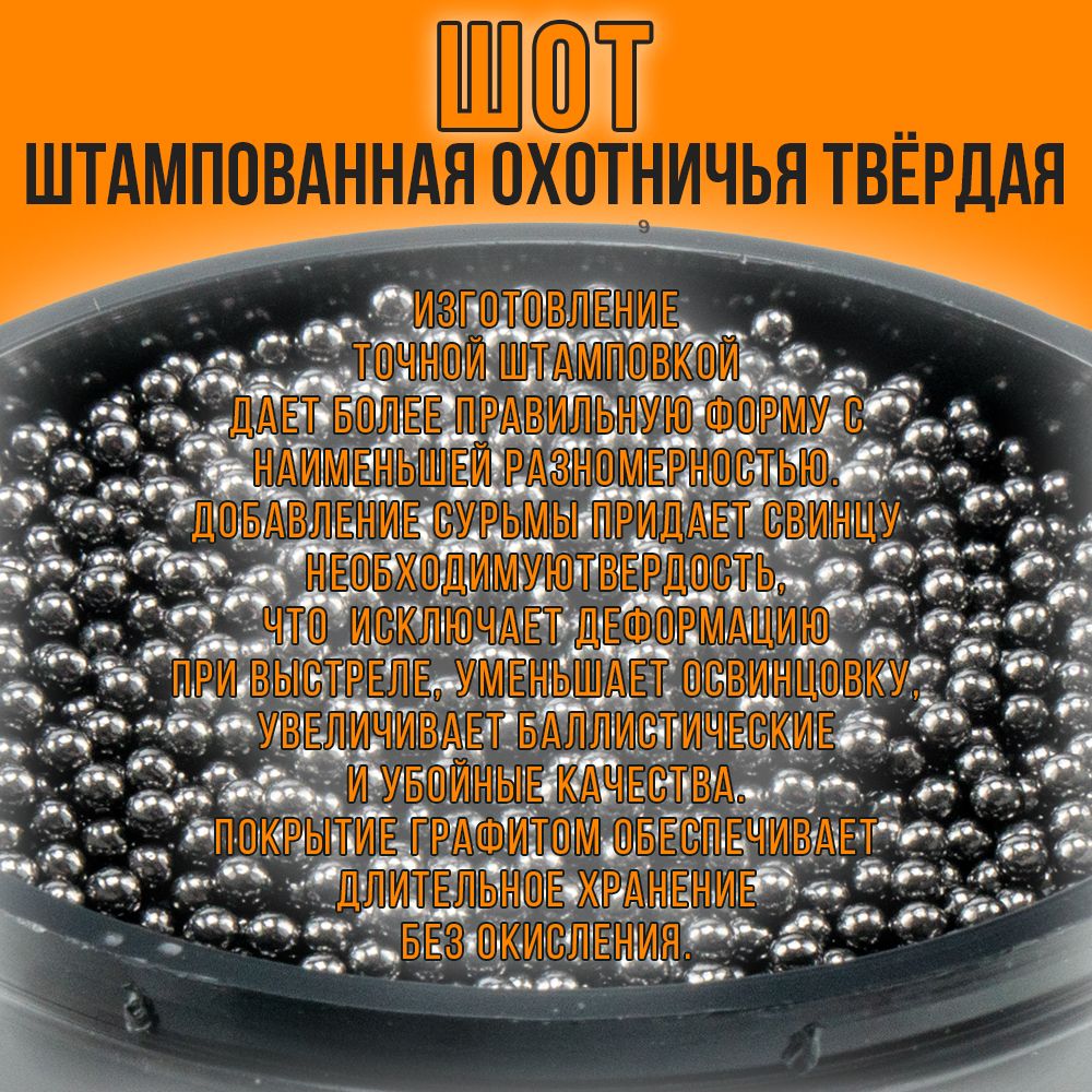 ШОТ- не деформируется при выстреле, не истирается о стенки канала ствола ( наименьшая освинцовка), сохраняет свои баллистические и убойные качества, выдерживает увеличенные скорости равномерной осыпи с нужной кучностью. Для борьбы с окислением и неограниченным хранением с наружи покрывается графитом. Дробь и картечь можно использоваться для стрельбы из рогатки.